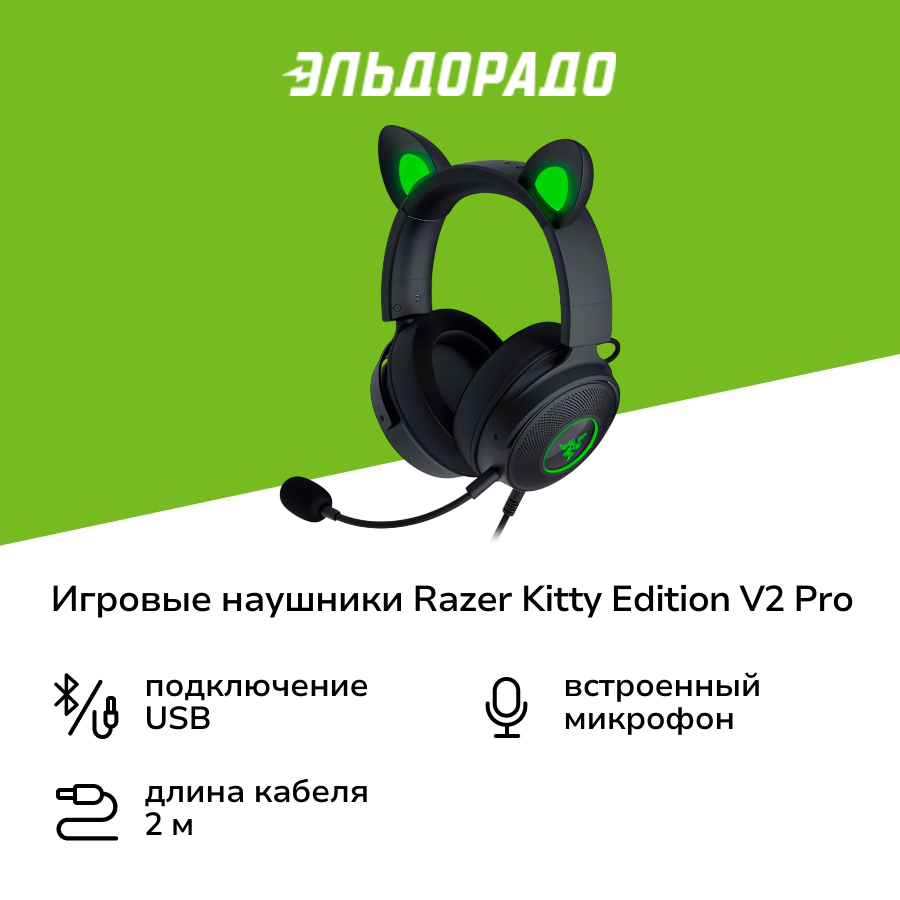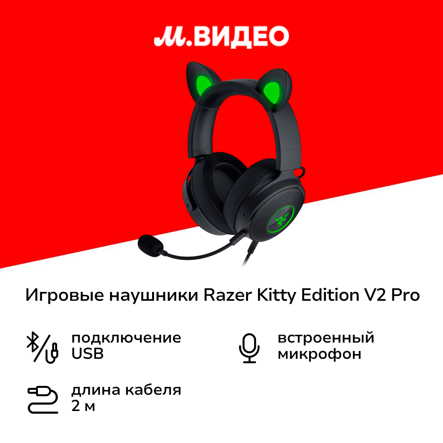 Игровые наушники Razer Kraken Kitty V2 (Black) ушки с RGB подсветкой, USB подключение