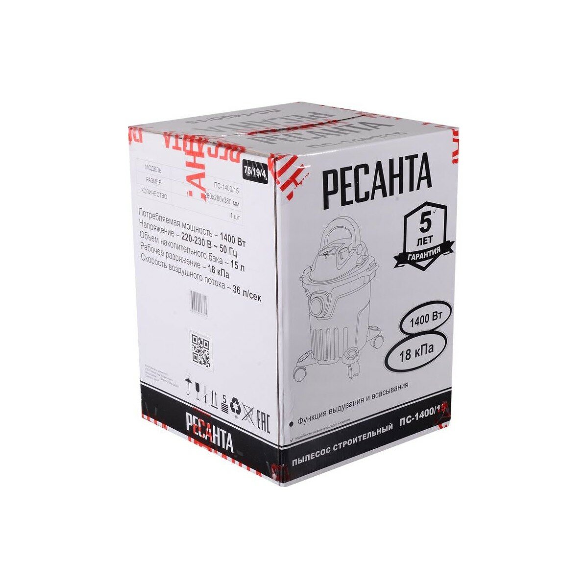 Купить Пылесос Ресанта ПС-1400, сухой и влажный, 15 л, 1400Вт