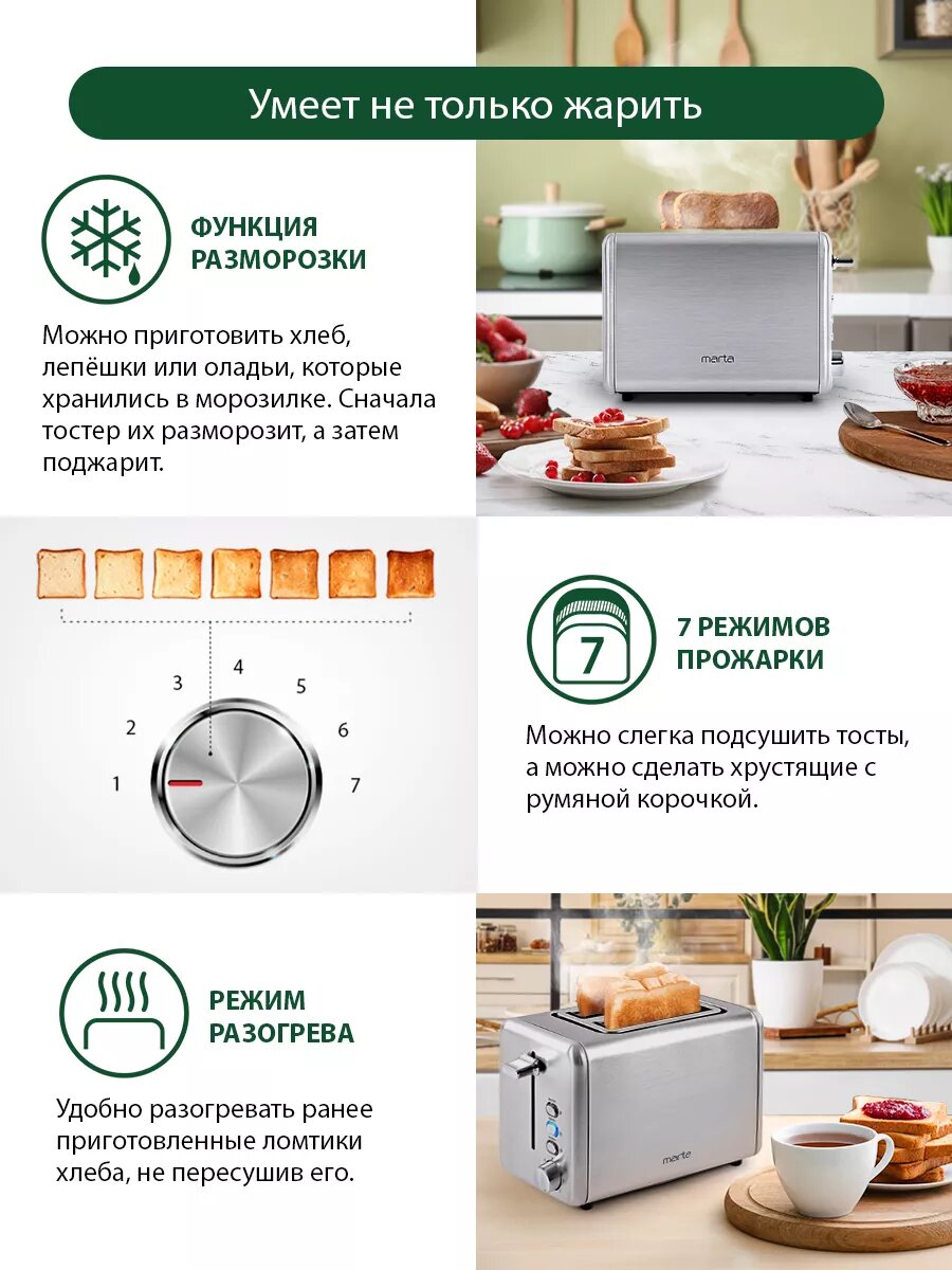 | Отзыв: | Главную функцию - поджарить хлеб - выполняет. Что важно: пользуюсь месяц, еще ни разу не подгорели тосты; удобно размораживать хлеб, который хранился в холодильнике. 7 режимов подогрева - на любой вкус. Равномерная прожарка тостов. Удобно, что у кнопок есть подсветка. |