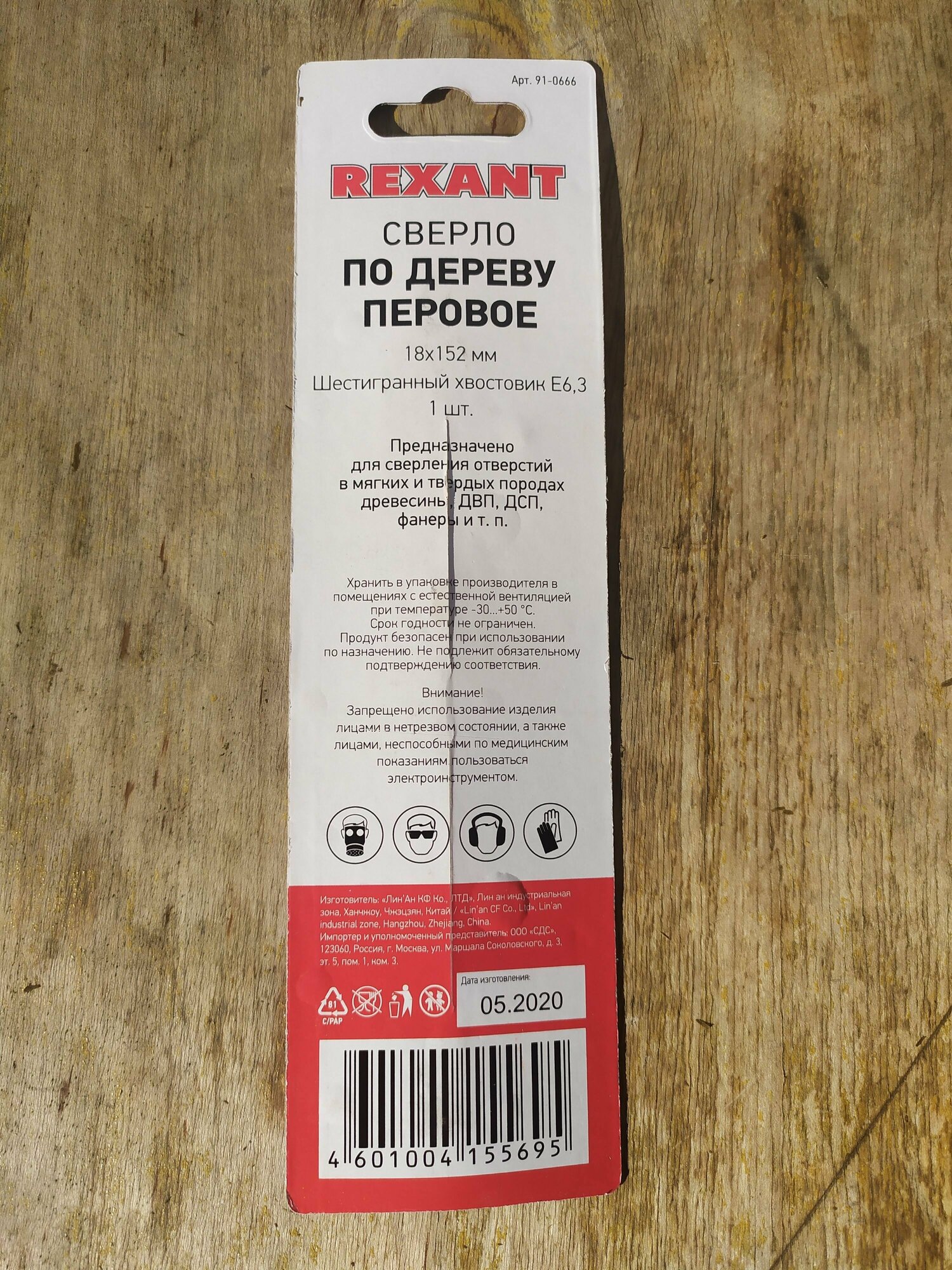 Сверло перовое по дереву 18х152 мм (шестигранный хвостовик) REXANT Артикул 91-0666
