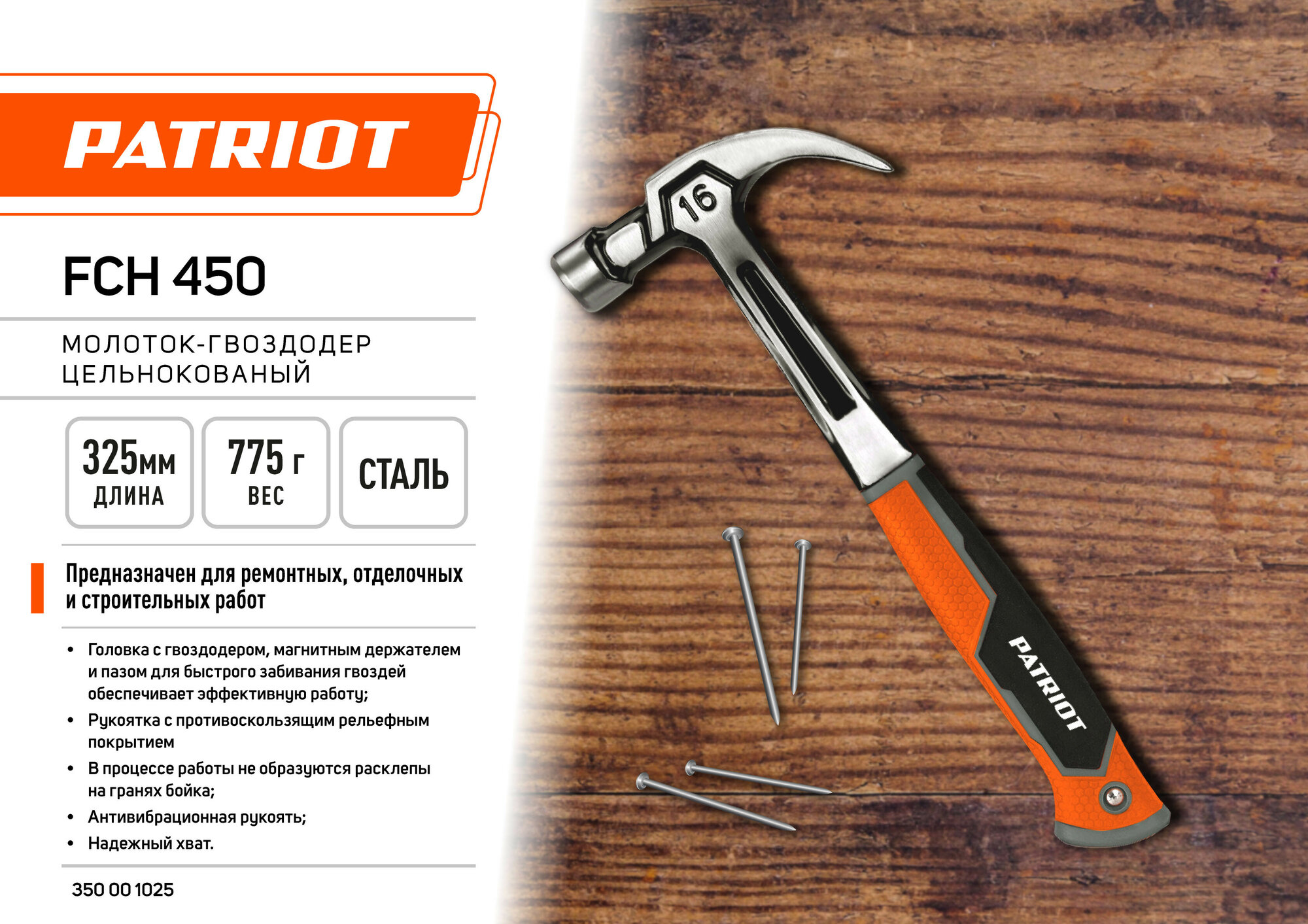 СохранитьМолоток-гвоздодер цельнокованый Patriot FCH 450, 775 гр интересное: