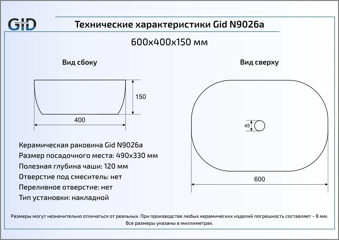 Раковина для ванной / Раковина накладная CeramaLux 9026A без перелива