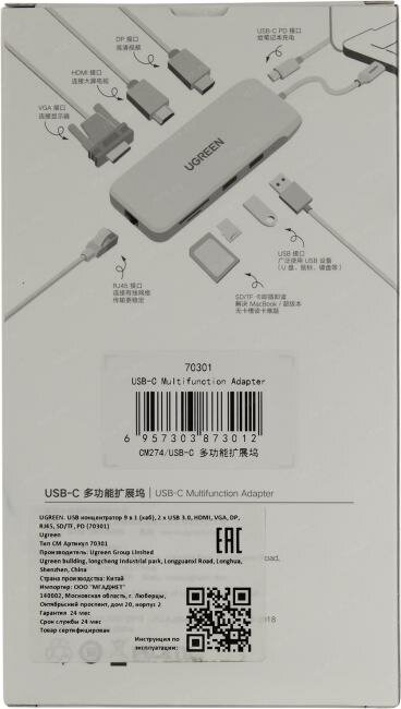 UGREEN. USB концентратор 9 в 1 (хаб), 2 х USB 3.0, HDMI, VGA, DP, RJ45, SD/TF, PD (70301)