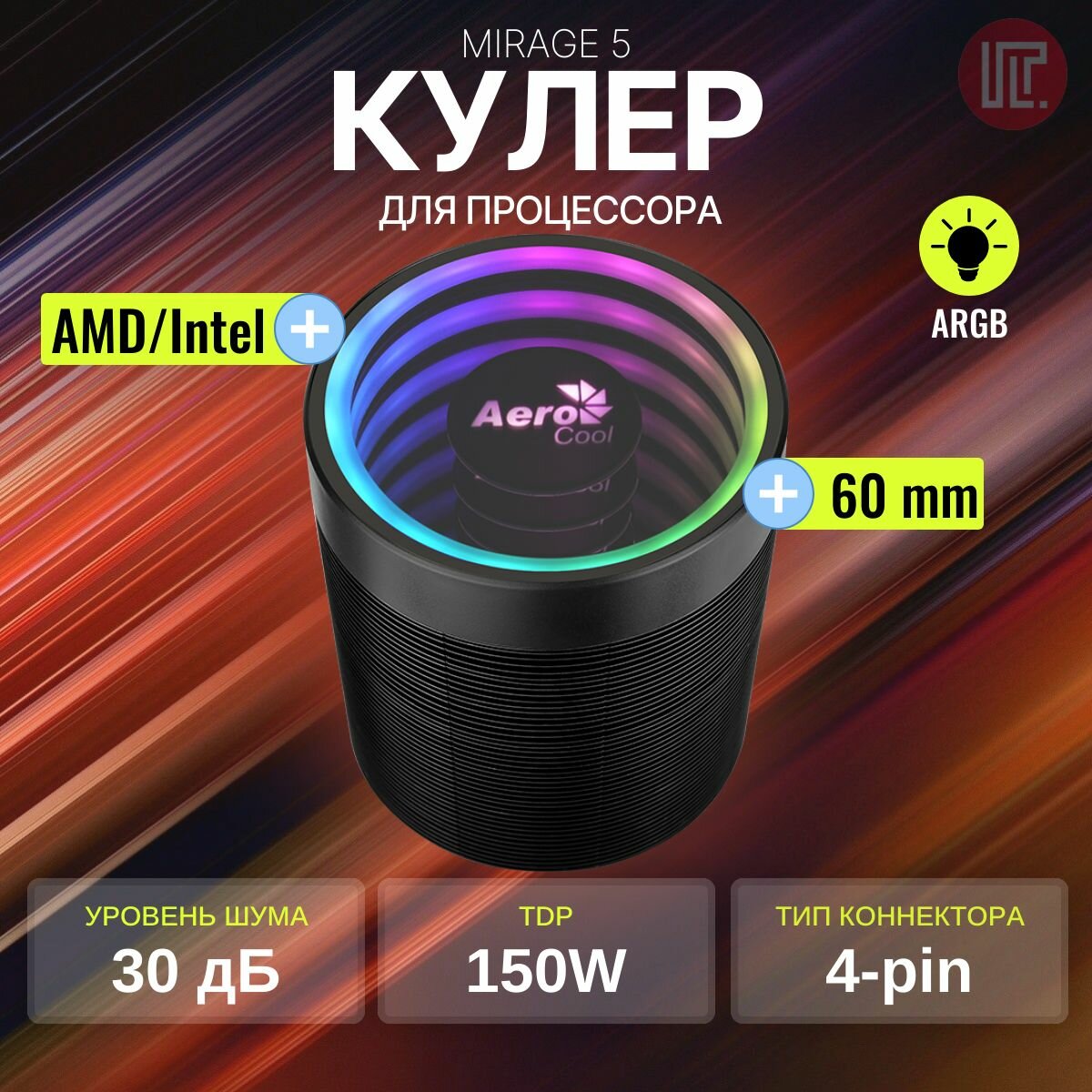 Вентилятор для процессора Aerocool Mirage 5 ARGB PWM 4P (4pin, 775/1155/2011/1200/2066/AM4-FM1, 18-30дБ, 1200-3000об/мин, Al+т.трубки)