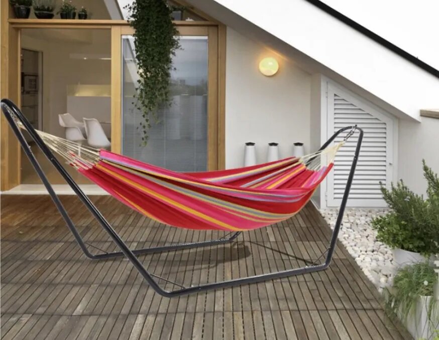 | Плюсы: | Хорошая стойка, собирается за 5 минут, прямо на крюки вешается гамак |