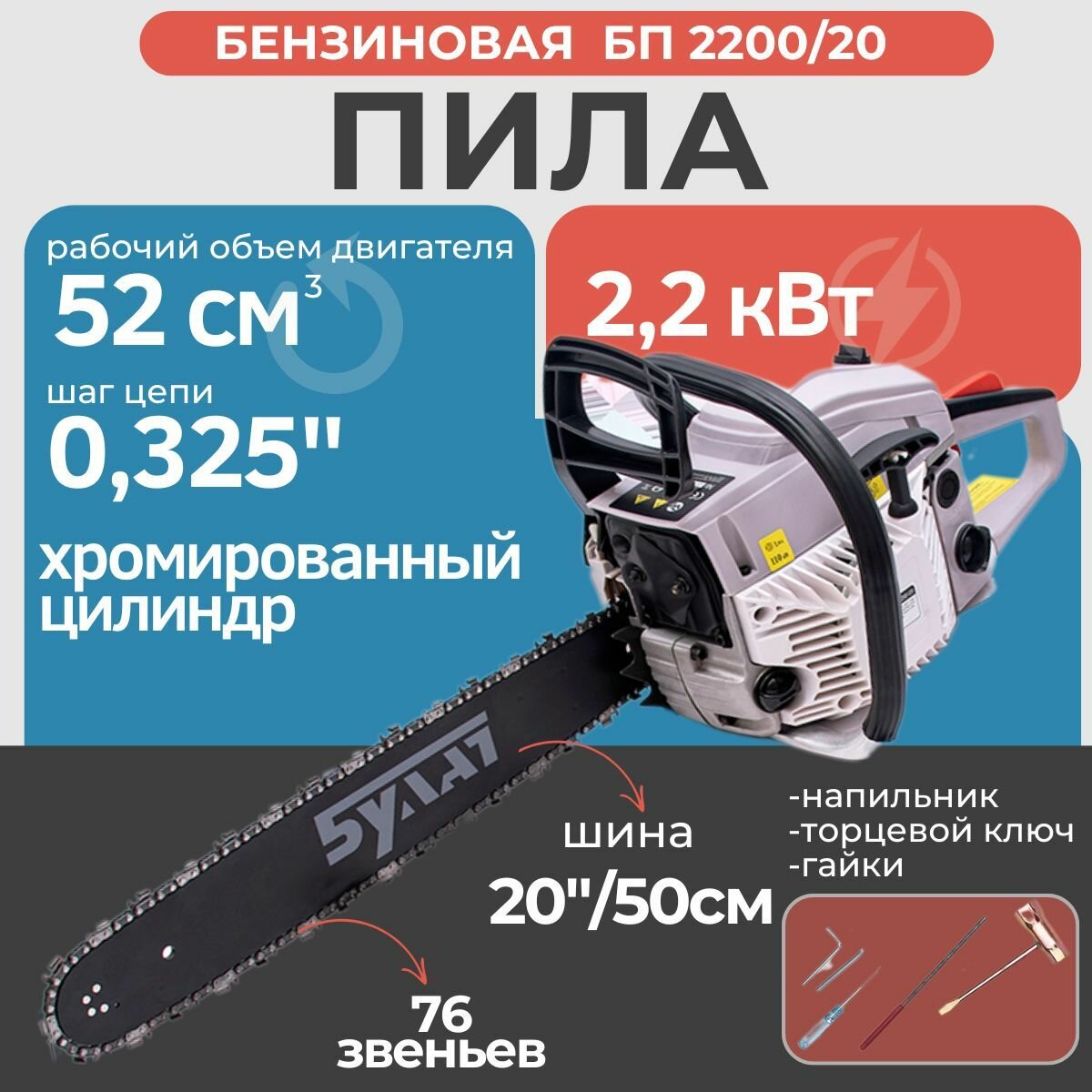 Булат Бензопила 2,2кВт, шина50см 0,325", объём52см3 праймер, хром.цилиндр БП 2200/20