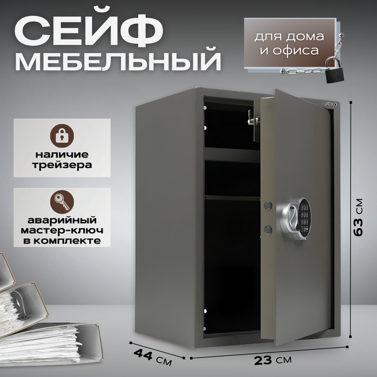 Сейф AIKO "ТМ-63ТEL", 630х440х355 мм, 29 кг, электронный замок, трейзер, полка