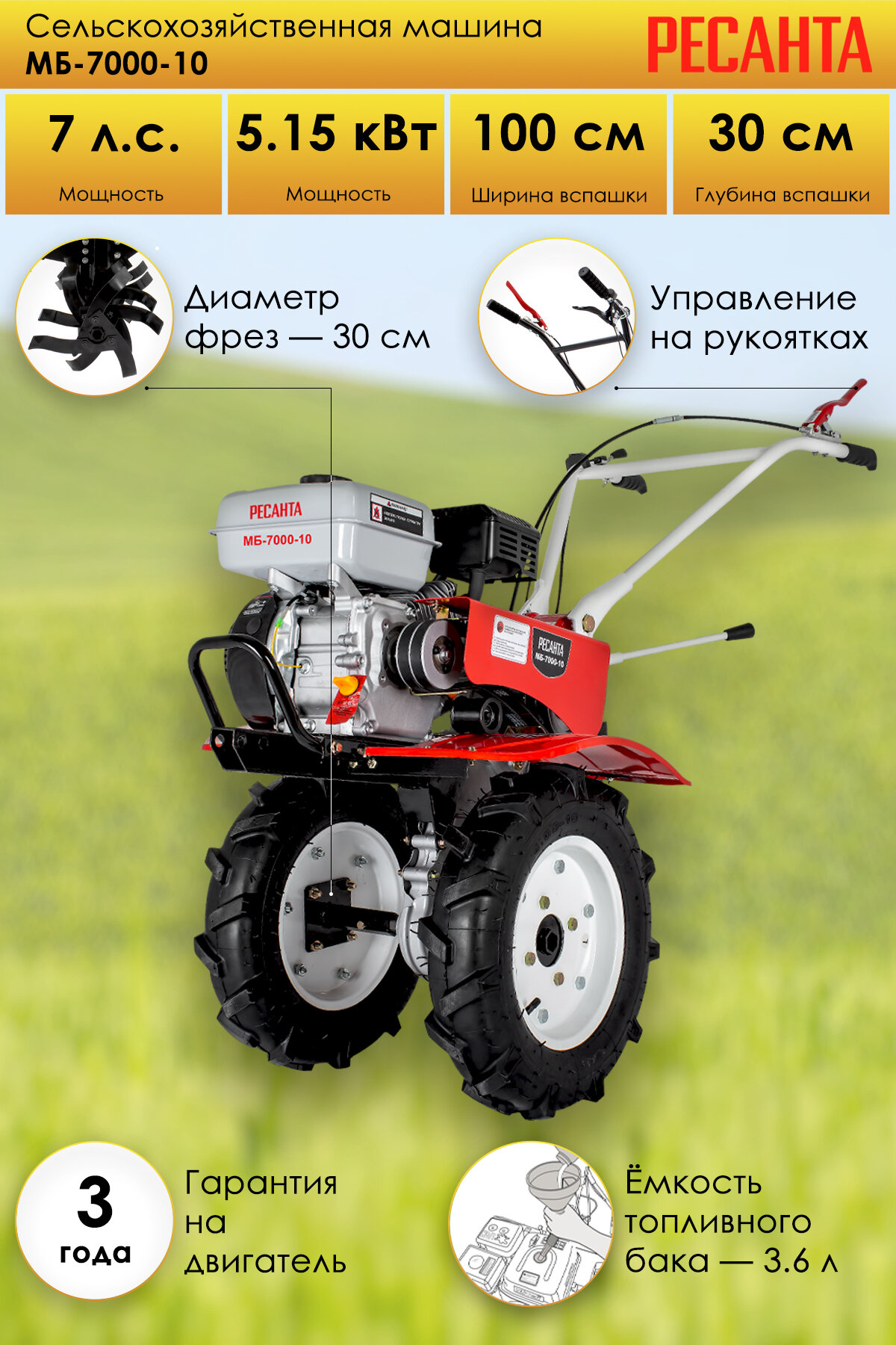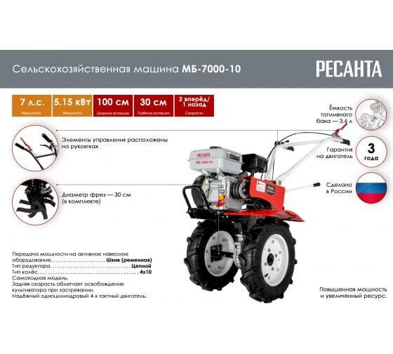 Мотоблок бензиновый / сельскохозяйственная машина Ресанта МБ-7000P-10 (7 л.с., четырехтактный, бензин, бак 3.6 л, ширина 100 см) интересное: