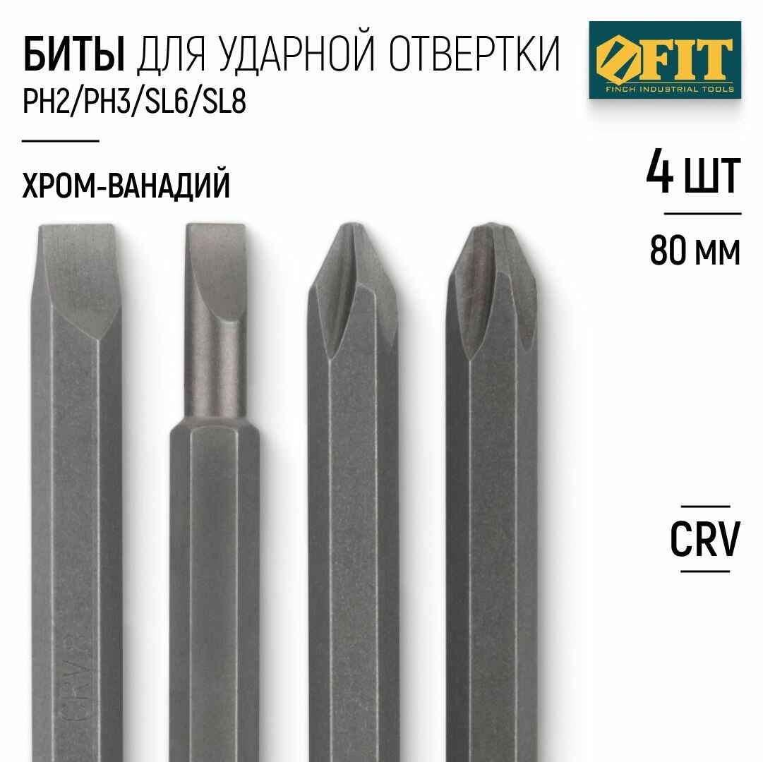 Купить FIT Биты сверхпрочные PH2, PH3, SL6, SL8 для ударной отвертки 5/16" L 80 мм CrV хром-ванадиевая сталь набор 4 шт