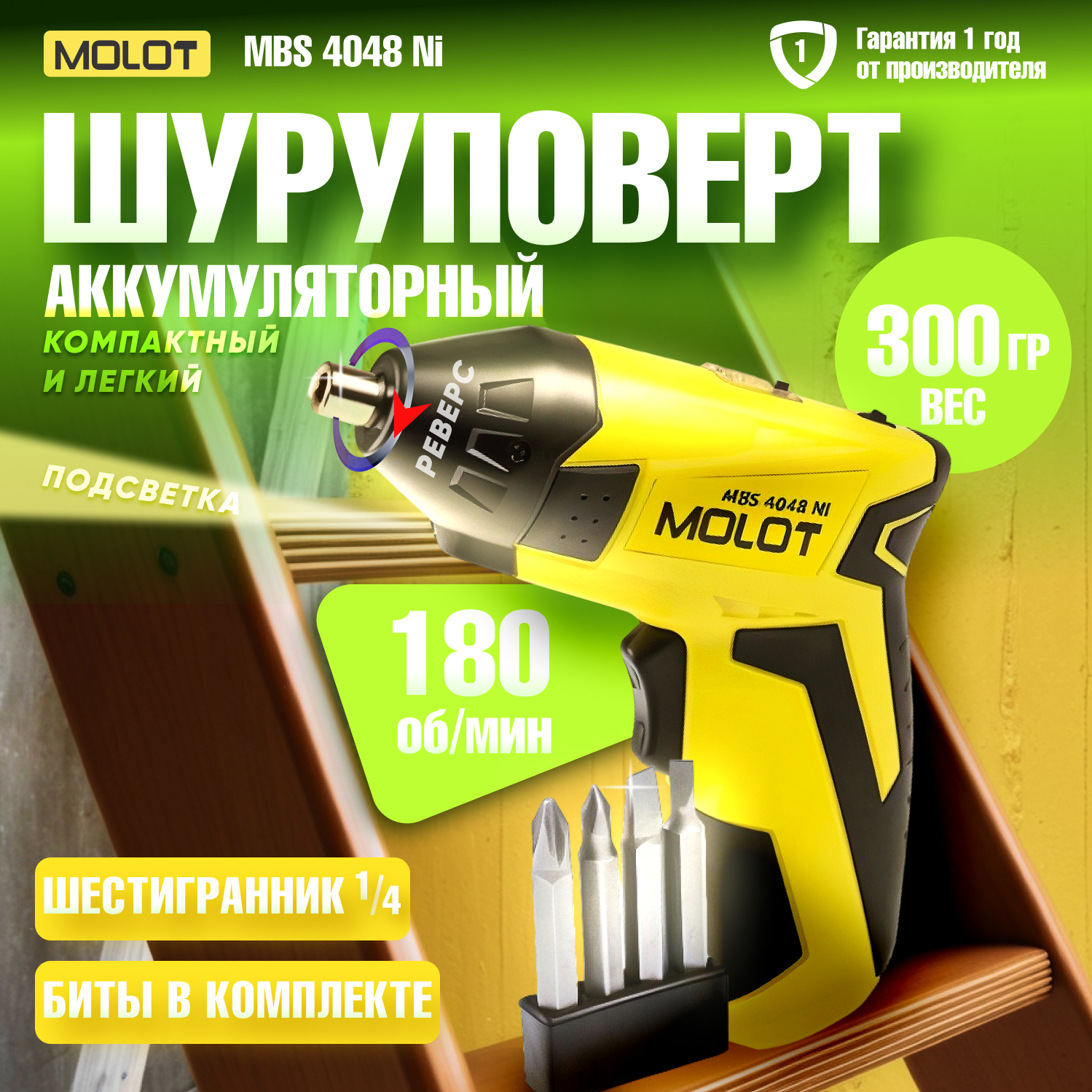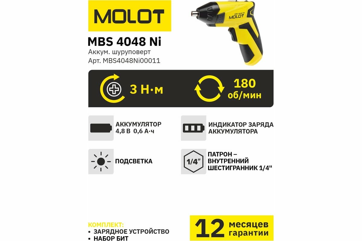 Аккум. шуруповерт MOLOT MBS 4048 Ni в блистере+ набор бит (4.8 В, 1 акк., 0.6 А/ч Ni-Cd, 1 скор., 3 Нм, шурупы до 4 мм) (MBS4048Ni00011)