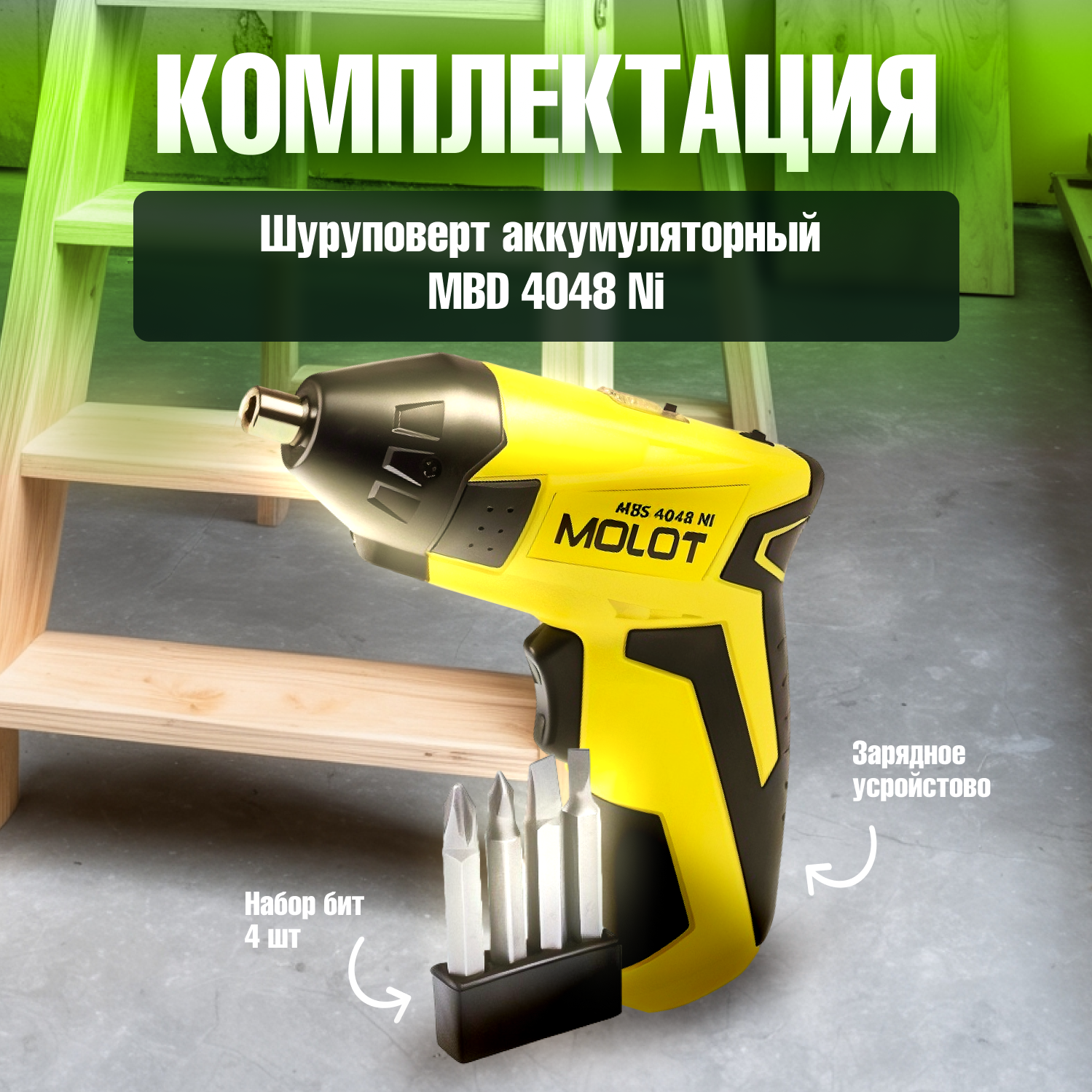 Аккум. шуруповерт MOLOT MBS 4048 Ni в блистере+ набор бит (0.6 А/ч Ni-Cd, 1 скор., шурупы до 4 мм) (MBS4048Ni00011)
