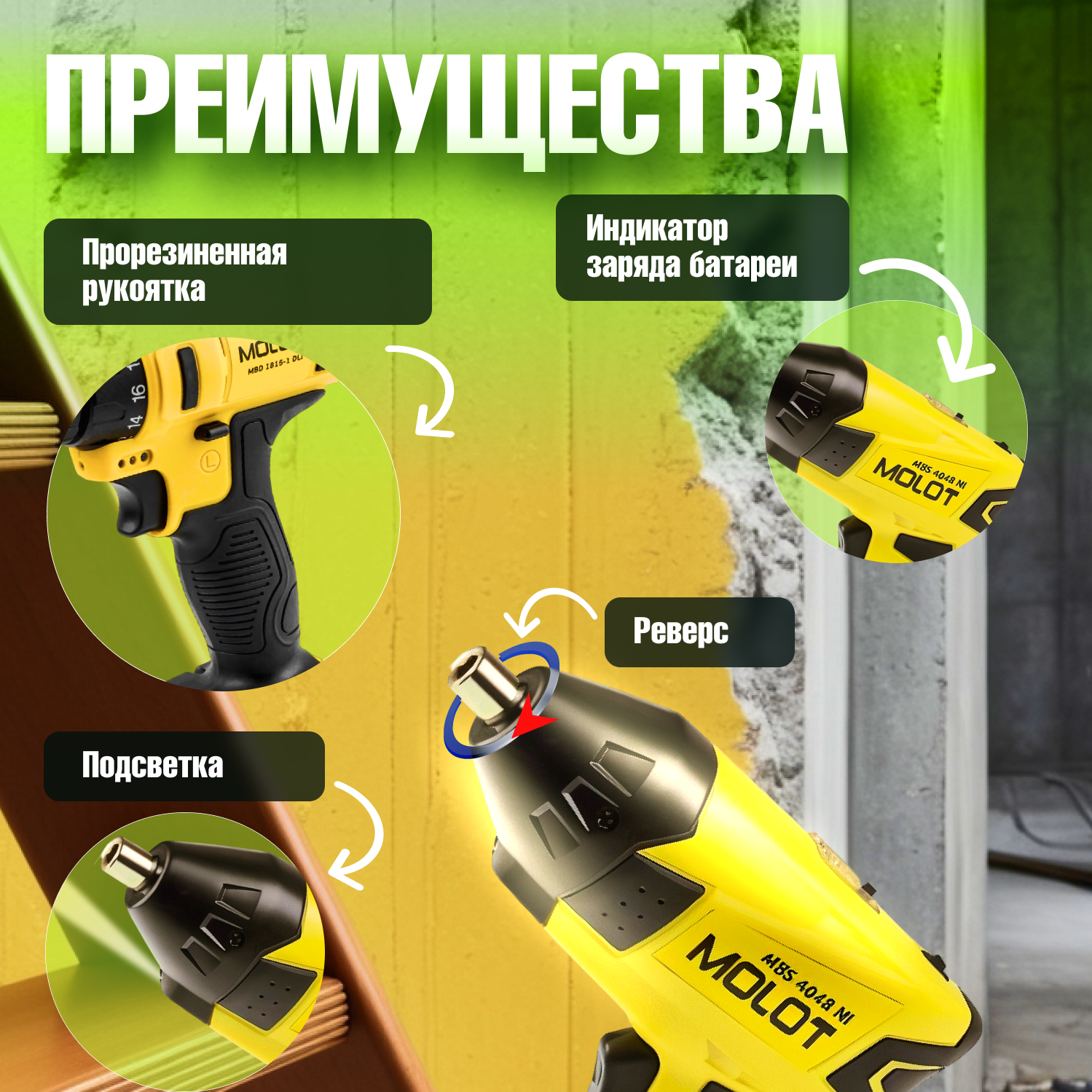 СохранитьШуруповерт аккумуляторный MOLOT MBS 4048 Ni (MBS4048Ni00011) интересное: