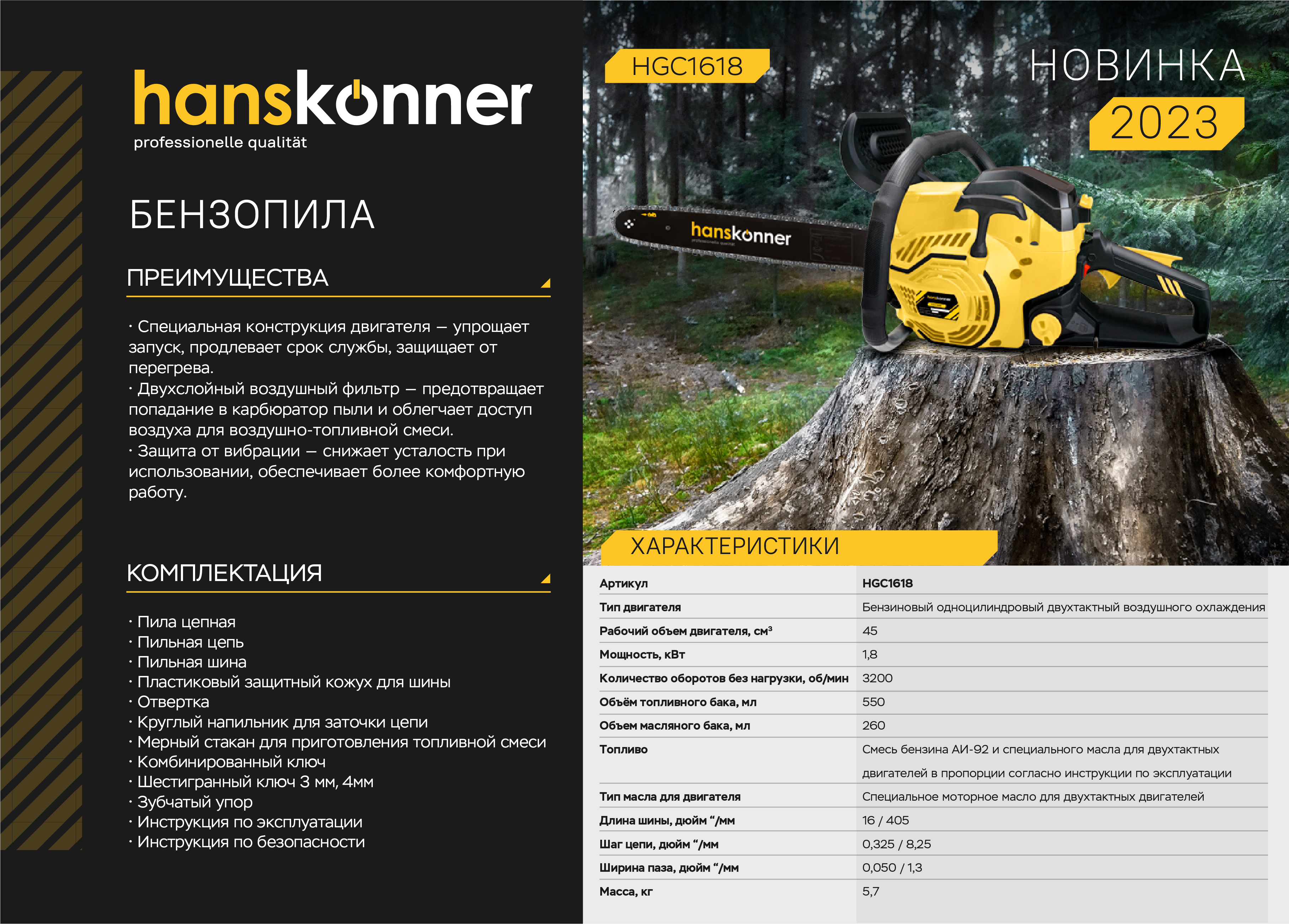 СохранитьБензопила Hanskonner HGC1618 (1.6 кВт/2.4 лс, 45 см3, 3200об/мин, шина 16", 6,65кг) интересное: