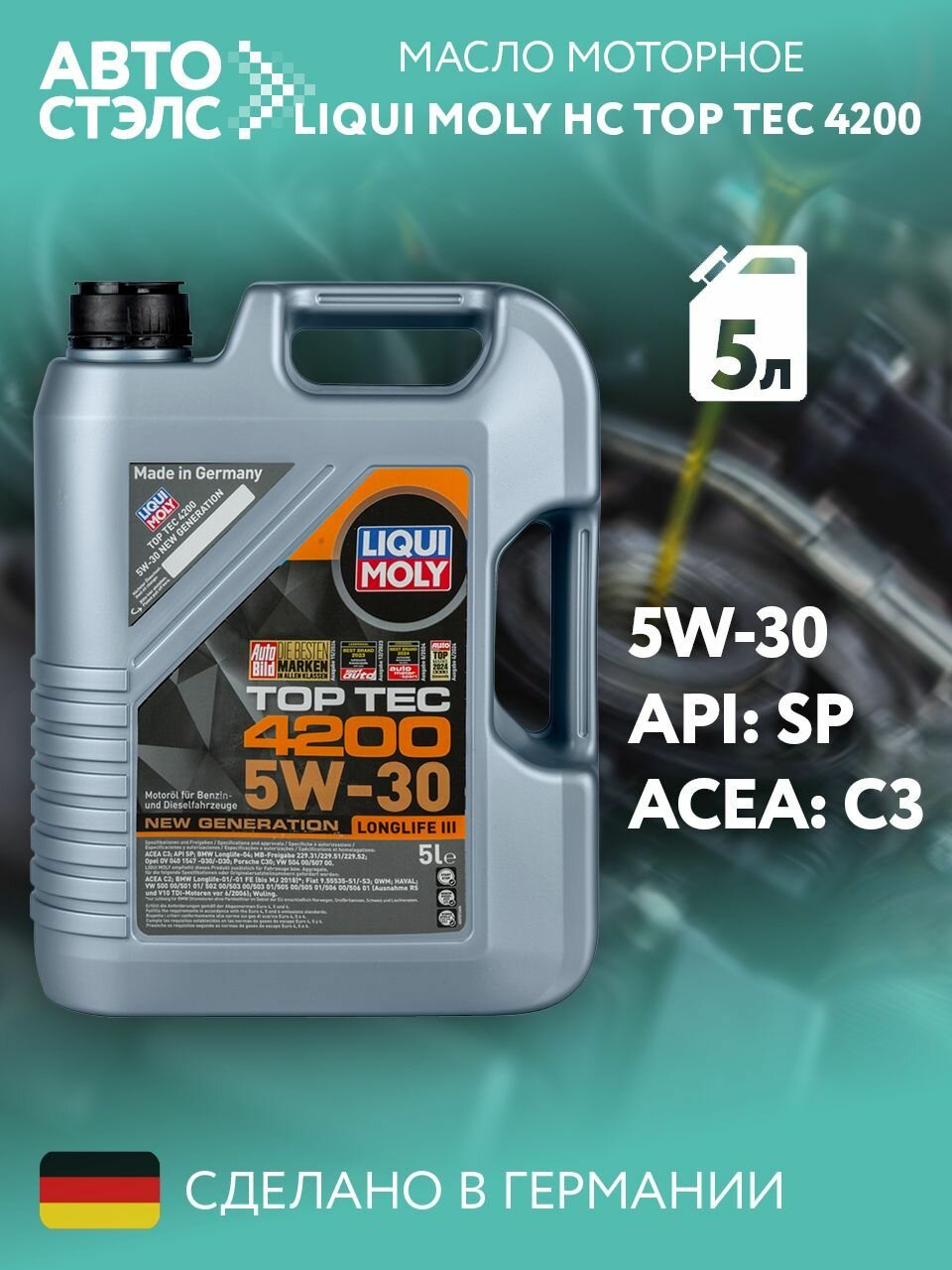 Ниже Вы можете прочитать отзывы на Масло моторное НС-синтетическое Liqui Moly TOP TEC 4200 5W-30 New Generation 5 л, ознакомится с подробными характеристиками, посмотреть интересные обзоры и фотографии на Масло моторное НС-синтетическое Liqui Moly TOP TEC 4200 5W-30 New Generation 5 л.