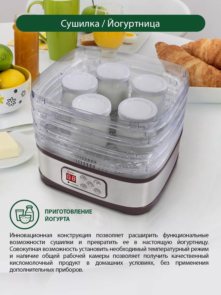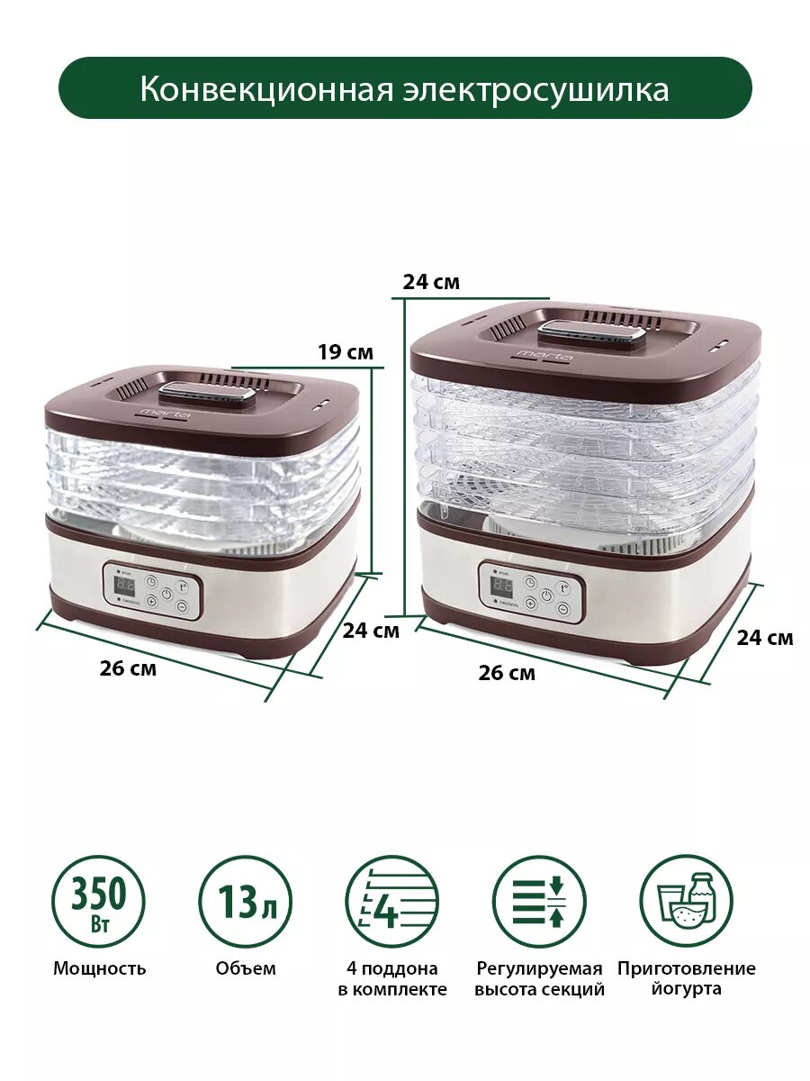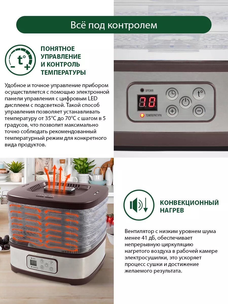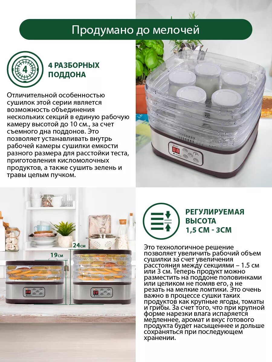 целых семь отдельных поддонов для сушки овощей и фруктов, работает абсолютно без шума, не потребляет много энергии.
