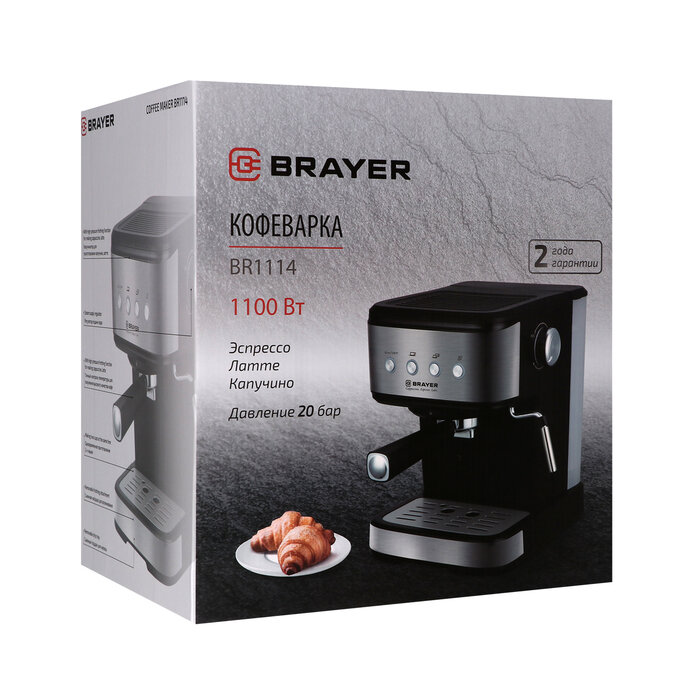 Купить Рожковая кофеварка BRAYER BR1114, 1100 Вт, эспрессо, латте, капучино, серебристая/черная