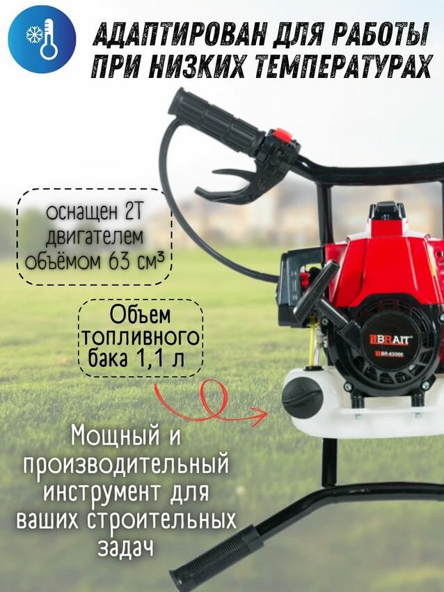 Мотобур 4-х ручный Brait BR-63/000 без шнека (2400 Вт, об/мин 277, объём бака 1.1 л, объём двигателя 63 см3) Бензобур / ямобур / для бурения интересное: