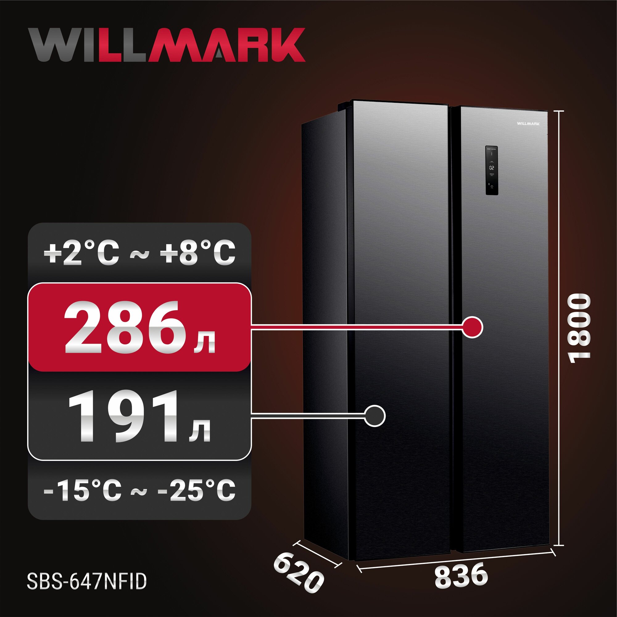 Холодильник Side-by-Side Willmark SBS-647NFID, 477 л., total NoFrost, с LED дисплеем, индикатором температуры