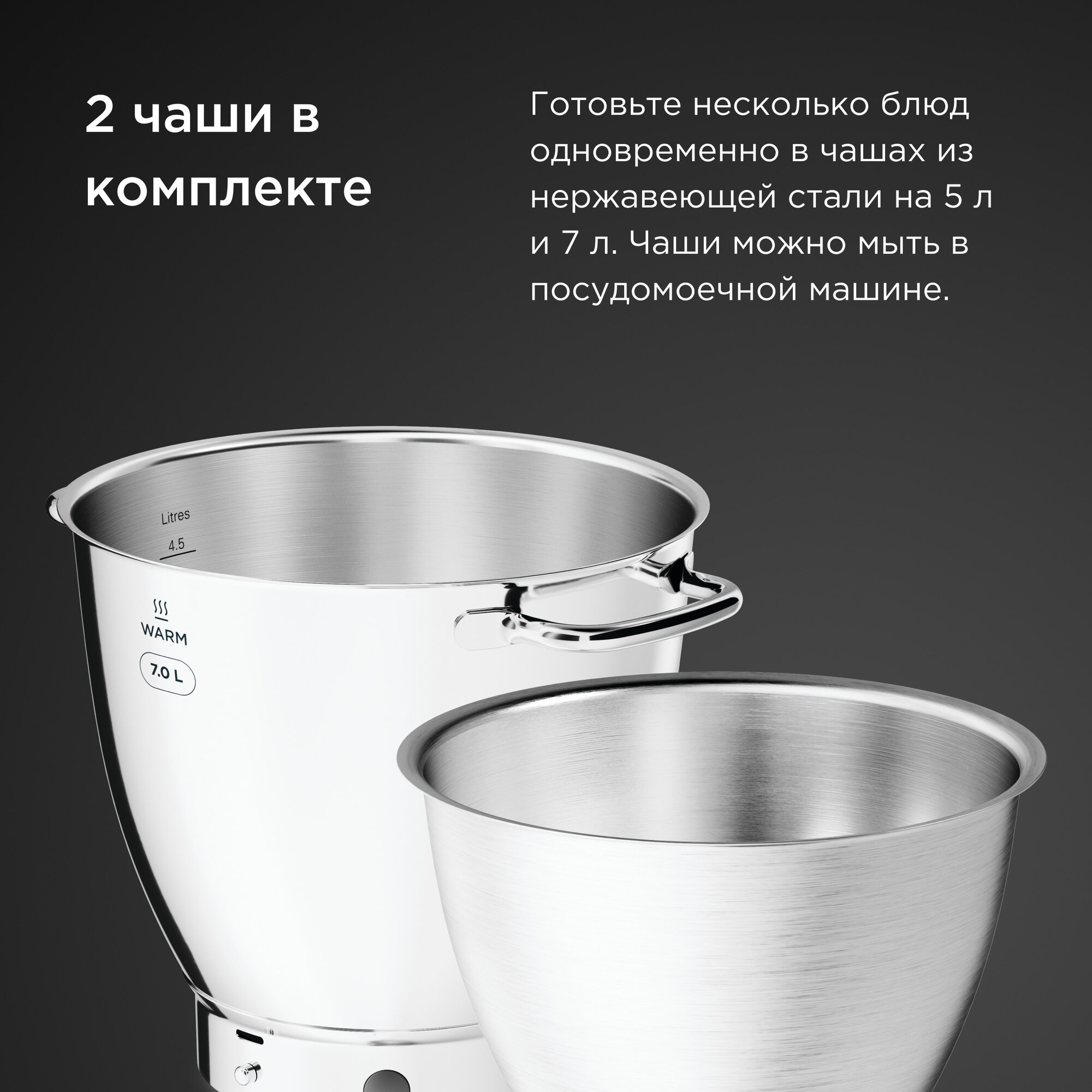 Я занимаюсь кондитерским делом и хороший помощник очень важен. Минус нет - это честно, проверен делом! Плюсы : Подогрев до ~65С Весы встроенные Установленные программы В комплекте - насадка К, крюк и супер венчик. 2 чаши! На 5 и 7 литров! В работе удобно. Совместимость с дополнительными насадками. Если любите работать с тестом - расстройка. Мощность отличная. Не шумный, подсветка чаши. Если ищите хорошую кухонную машину - это отличный вариант! |