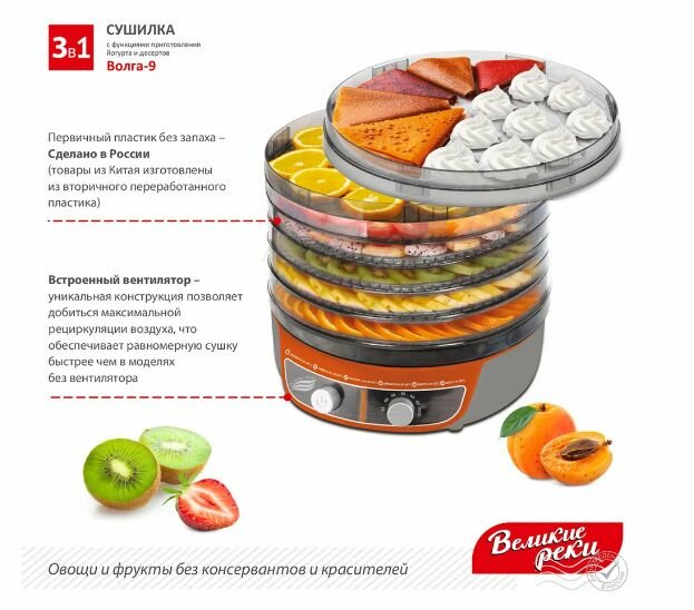 Сушилка для овощей Великие Реки Волга-9 серо-оранжевая 3в1 с функциями приготовления йогурта и десер .