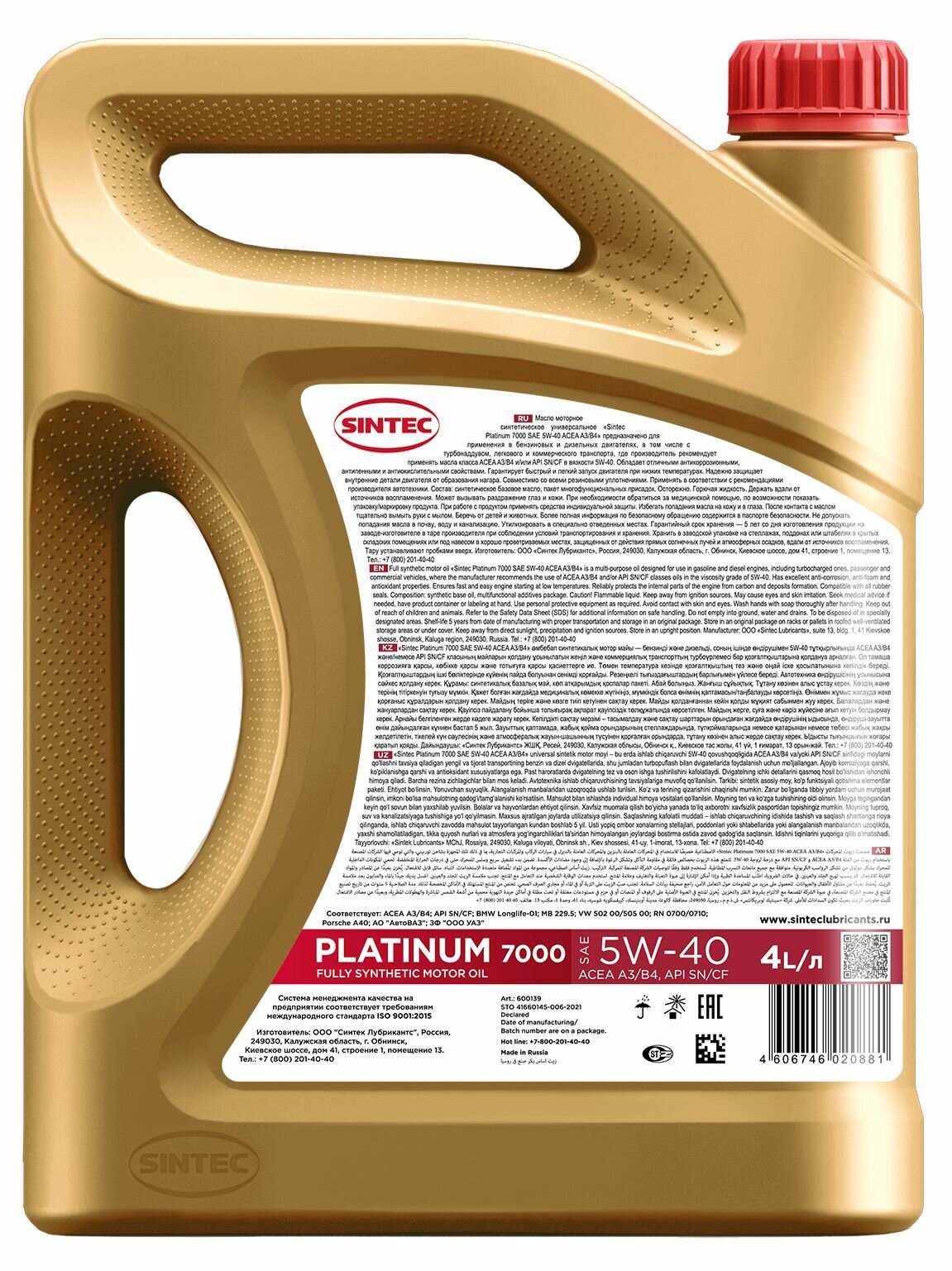 SINTEC Sintec 801941 Масло Моторное Sintecplatinum 5w-40 Синтетическое 4 Л