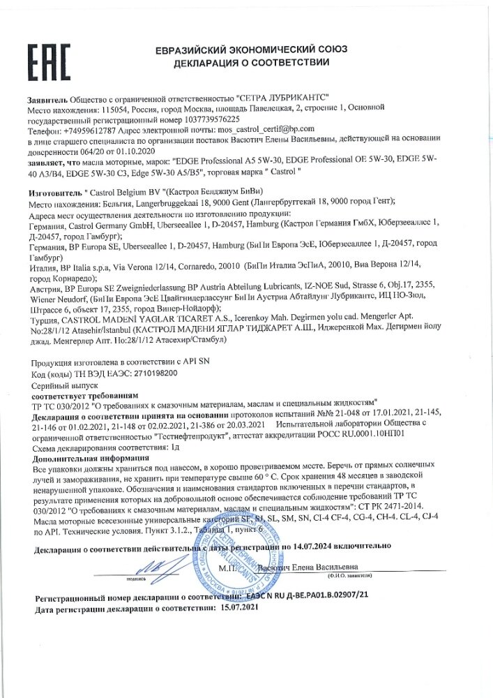 СохранитьCASTROL 157B1B Масло CASTROL 5W40 EDGE FST API SN/CF С3 502.00/505.00/505.01 1л син 157B1B/1535AA интересное: