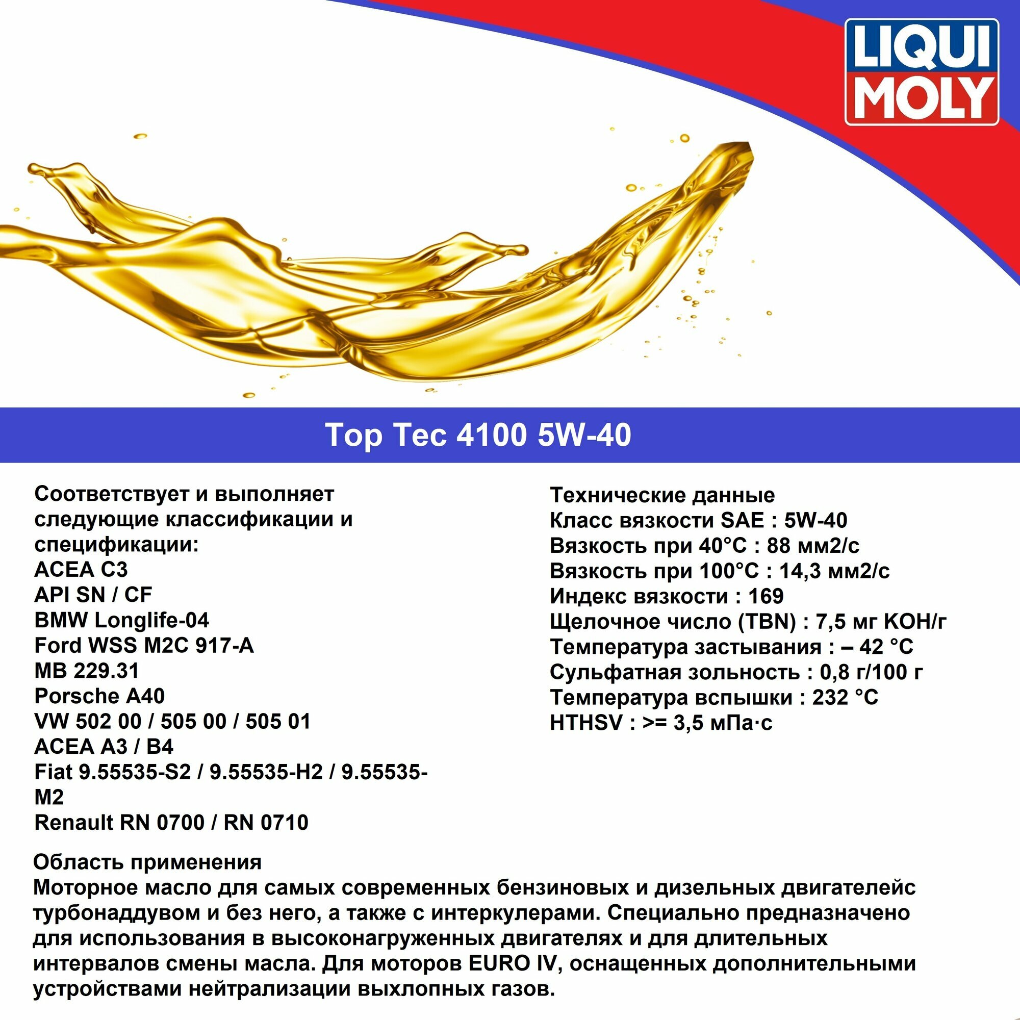 LiquiMoly НС-синт. мот.масло Top Tec 4100 5W-40 CF/SN C3 (4л), шт LiquiMoly