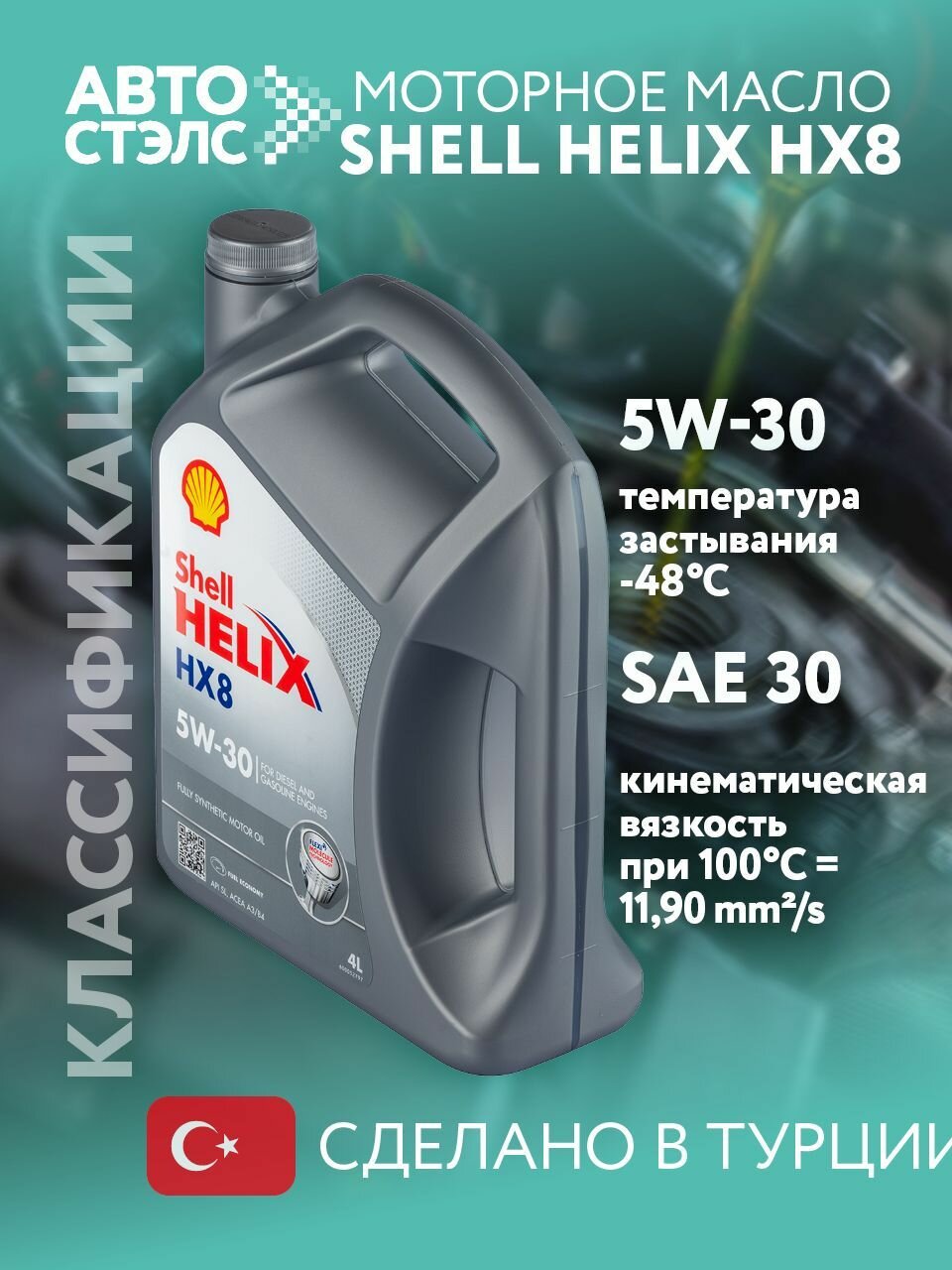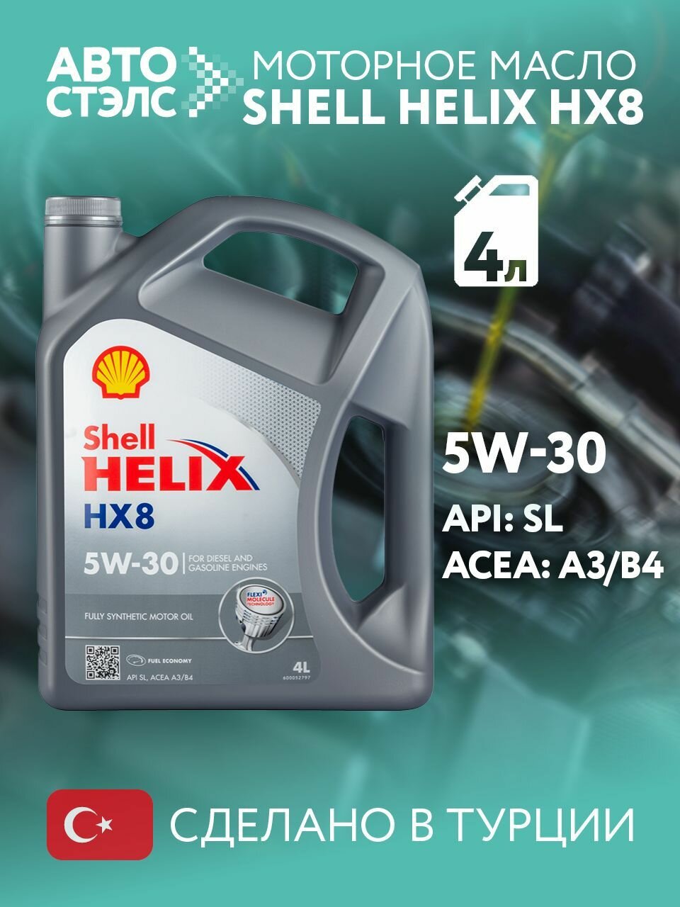 Моторное масло Shell Helix HX8 5W-30 синтетическое 4 л Сделано в Турции .