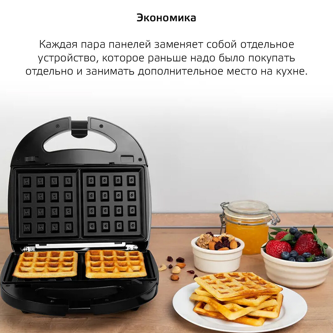 | Плюсы: | Три разных панели в комплекте и менять их не сложно, потому что для этого не нужны инструменты. А на ручке есть защёлка, чтобы не держать ручку рукой, когда пекутся вафельки. И управление элементарное - включила в розетку и всё |