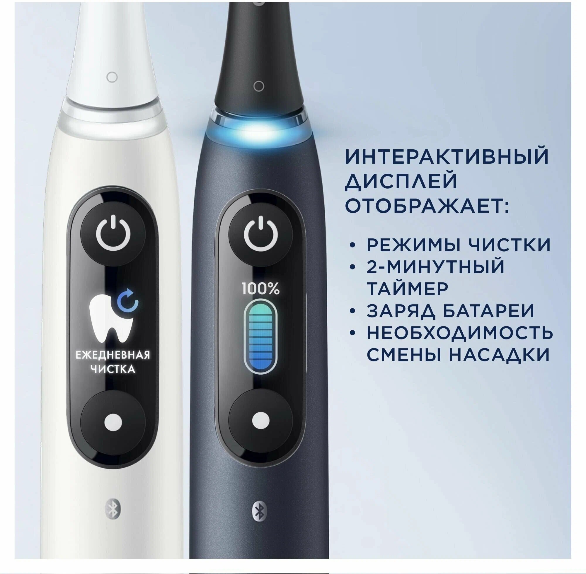 Красивый цветной дисплей Разные режимы Беспроводная зарядка Дорожный футляр с возможностью зарядки Программа по уходу за полостью рта и рекомендациями по чистке зубов |