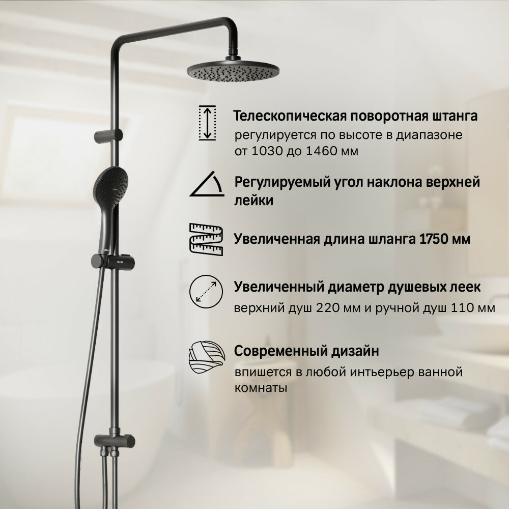 Душевая система с тропическим душем AM.PM Jump F0772022 черный, поворотный верхний душ 220мм, лейка 110мм, регулируемая по высоте штанга