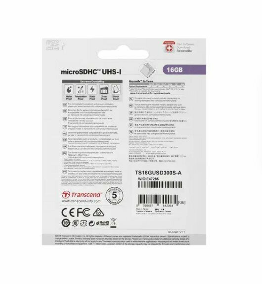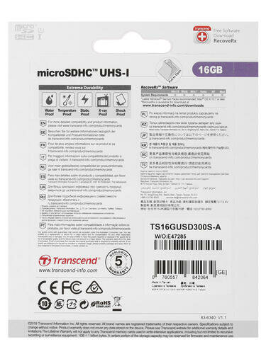 Transcend (ts16gusd300s-a) microSDHC 16Gb Uhs-i U1 + microSD--)SD Adapter .