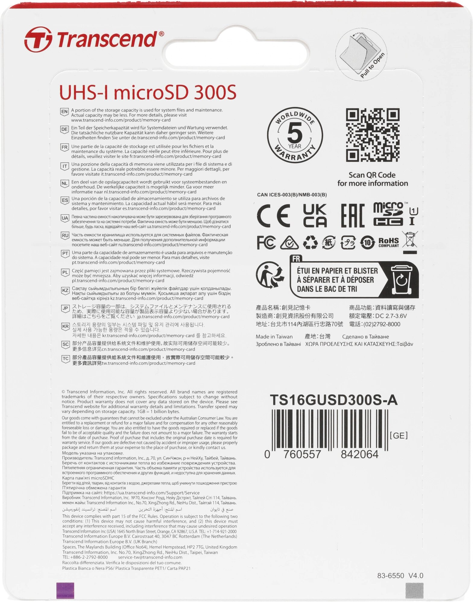Карта памяти Transcend microSDHC 300S Class 10 UHS-I U1 16GB (TS16GUSD300S)