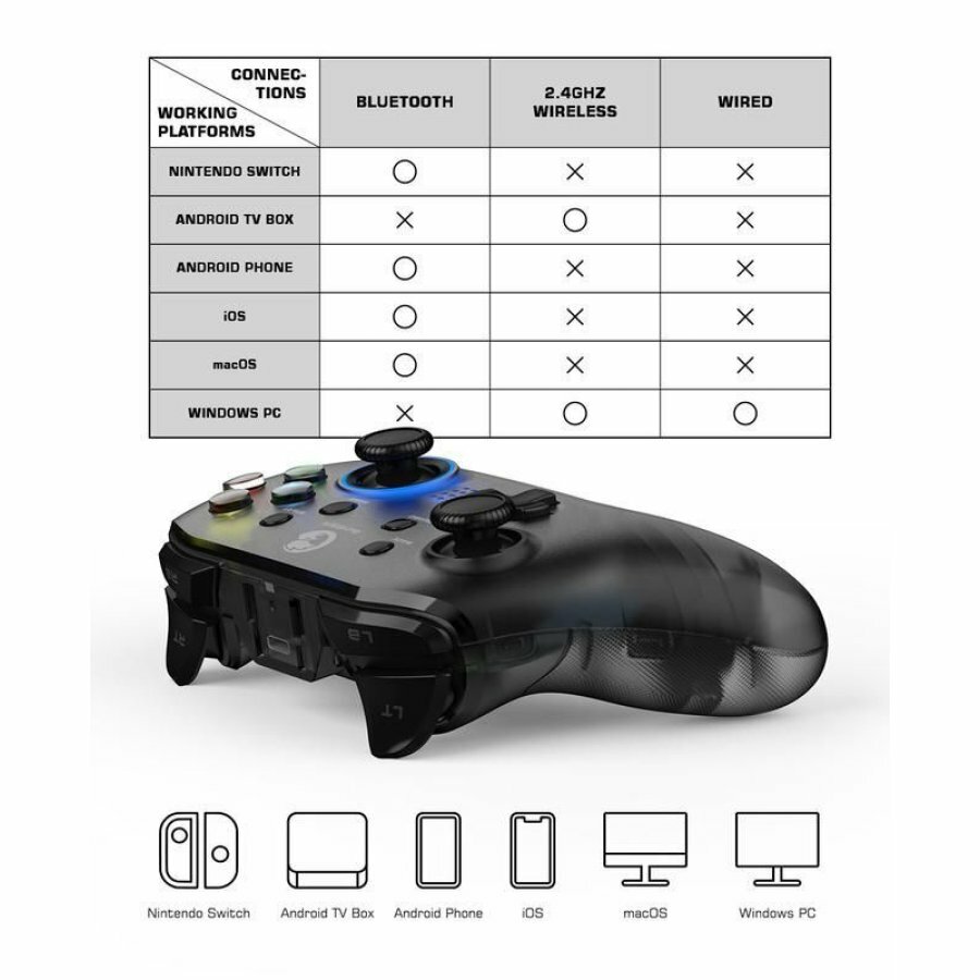 Тактильно приятный материал Подсветка Режимы для всех приставок Умный донгл Гироскоп Приятная вибро-отдача Крепление для смартфона Наклейки разных размеров Нет дрифта стиков и триггеров Практически отсутствует мертвая зона Приятный ход триггеров Дополнительные клавиши |