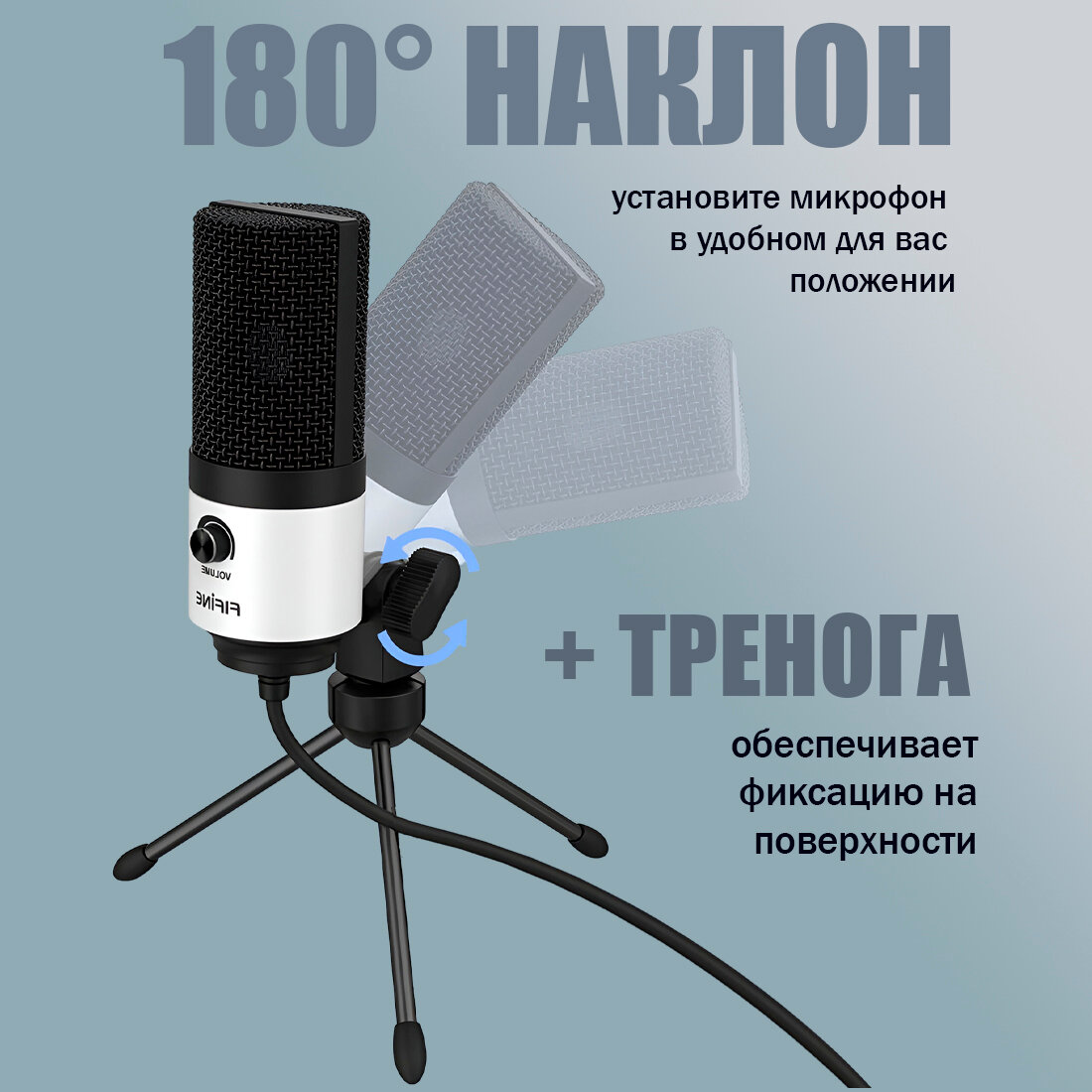 Микрофон FIFINE K669 (чёрный, на штативе, USB 5V, 20Hz-20kHz, -34dB±30% (1kHz), S/N 78dB, шнур 1.8 м, рег. громкости)