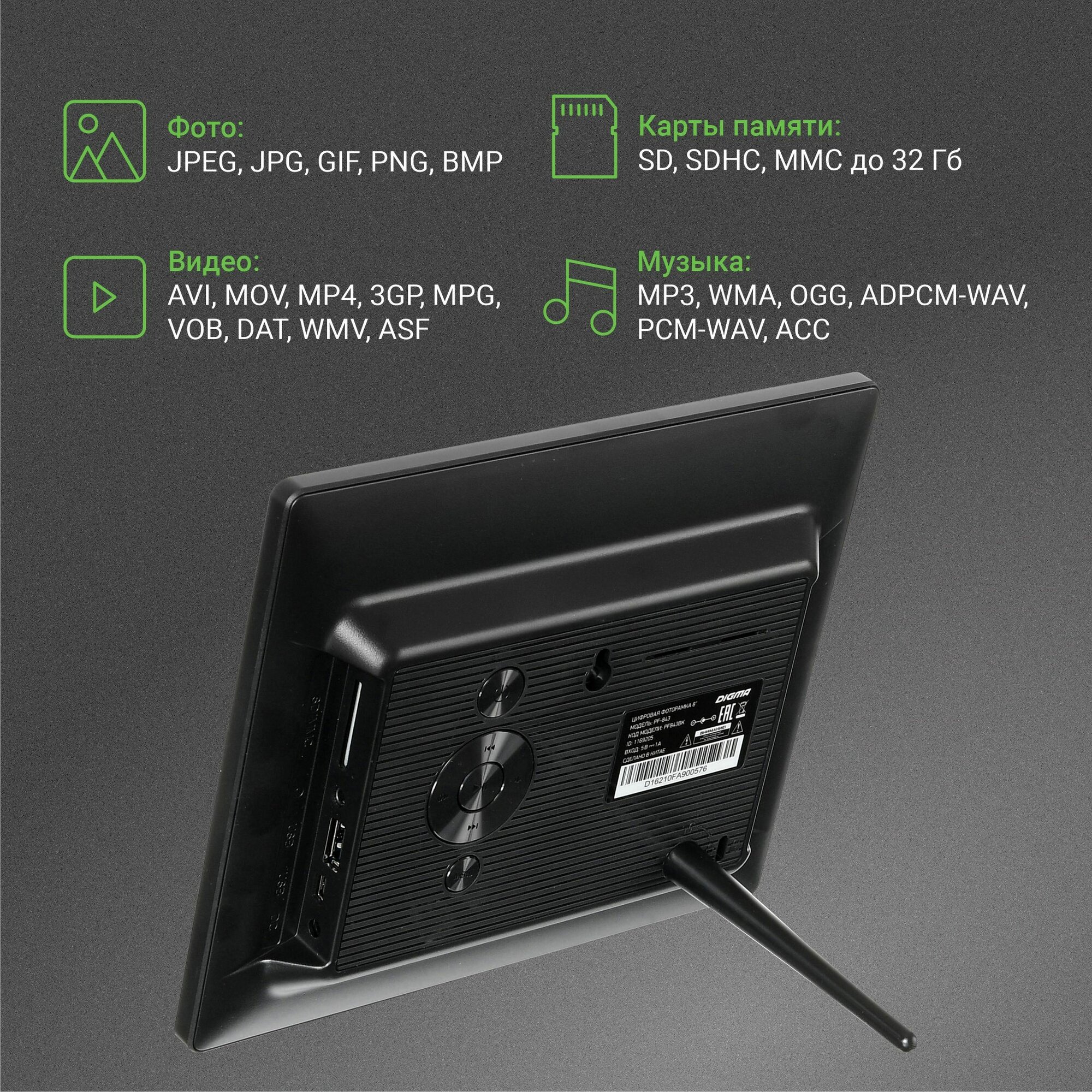 Купить Фоторамка Digma 8" PF-843 IPS 1024x768, черный пластик, ПДУ, видео