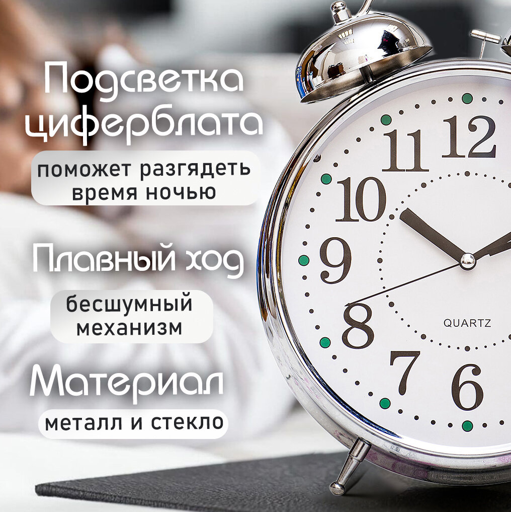 Часы Будильник гигант никелированные с подсветкой Эврика, часы настольные, подарочные