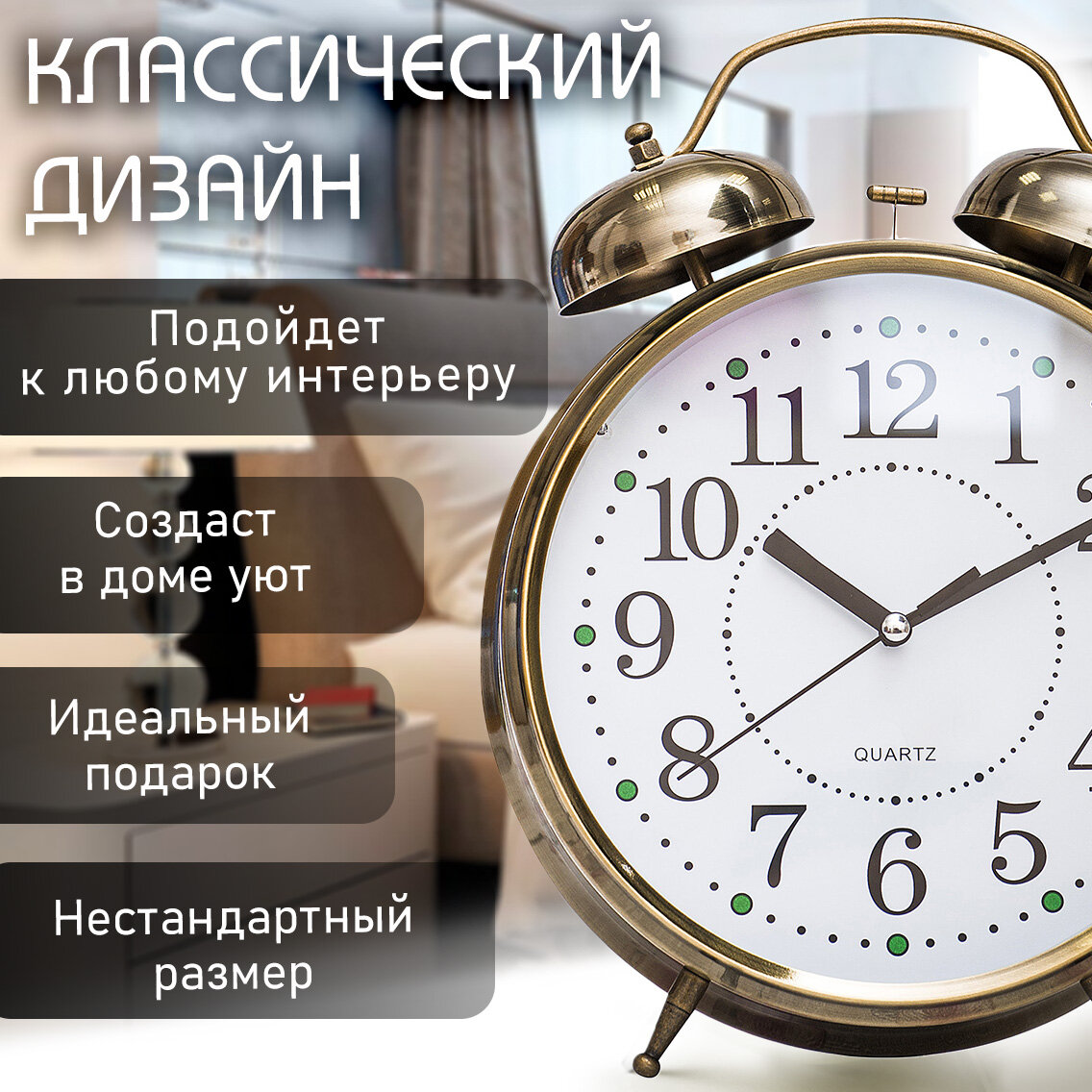 СохранитьЧасы Будильник гигант бронзового цвета с подсветкой Эврика, часы настольные большие, подарочные интересное: