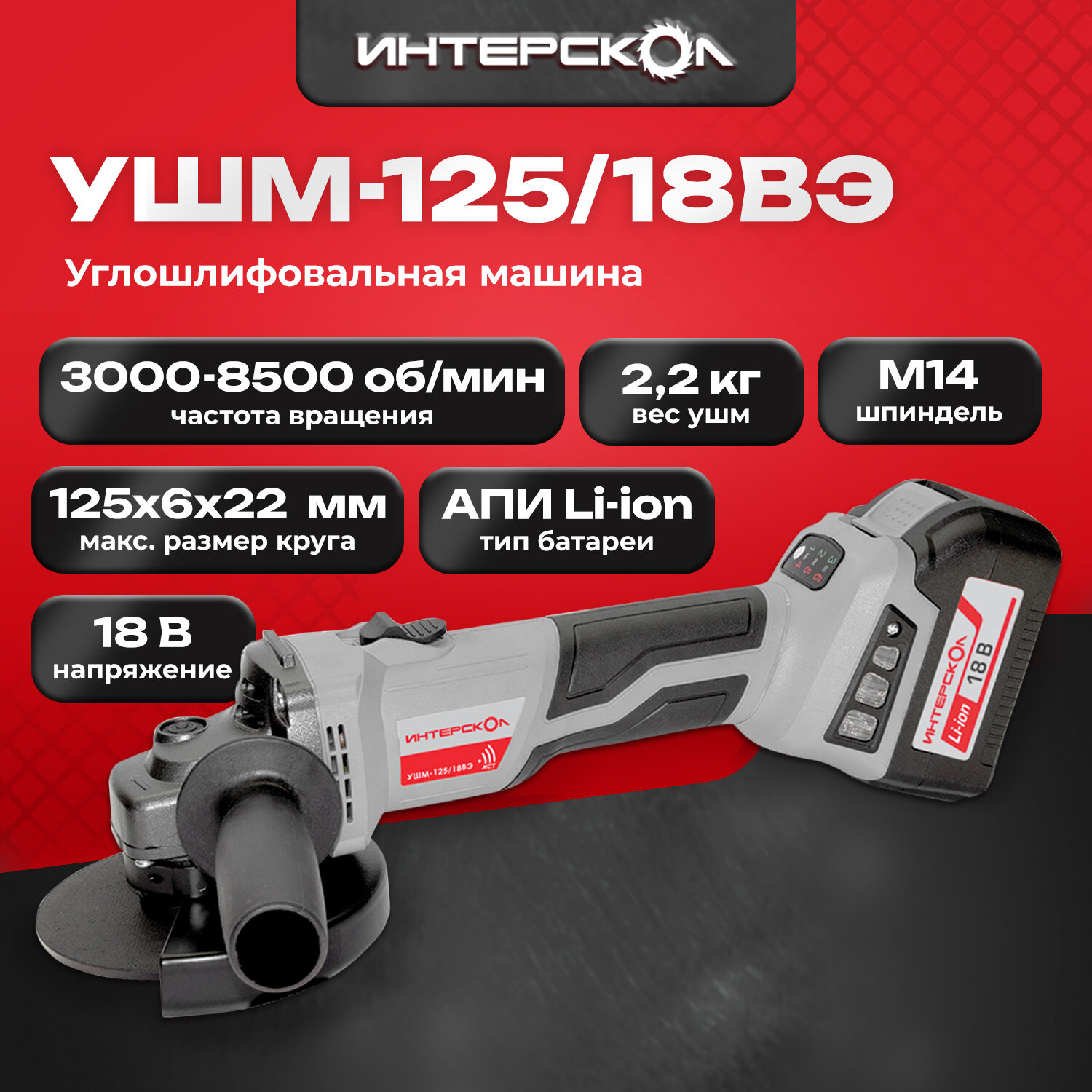 УШМ Интерскол 125/18ВЭ акк. Li-ion АПИ (картон, без аккум. и ЗУ)