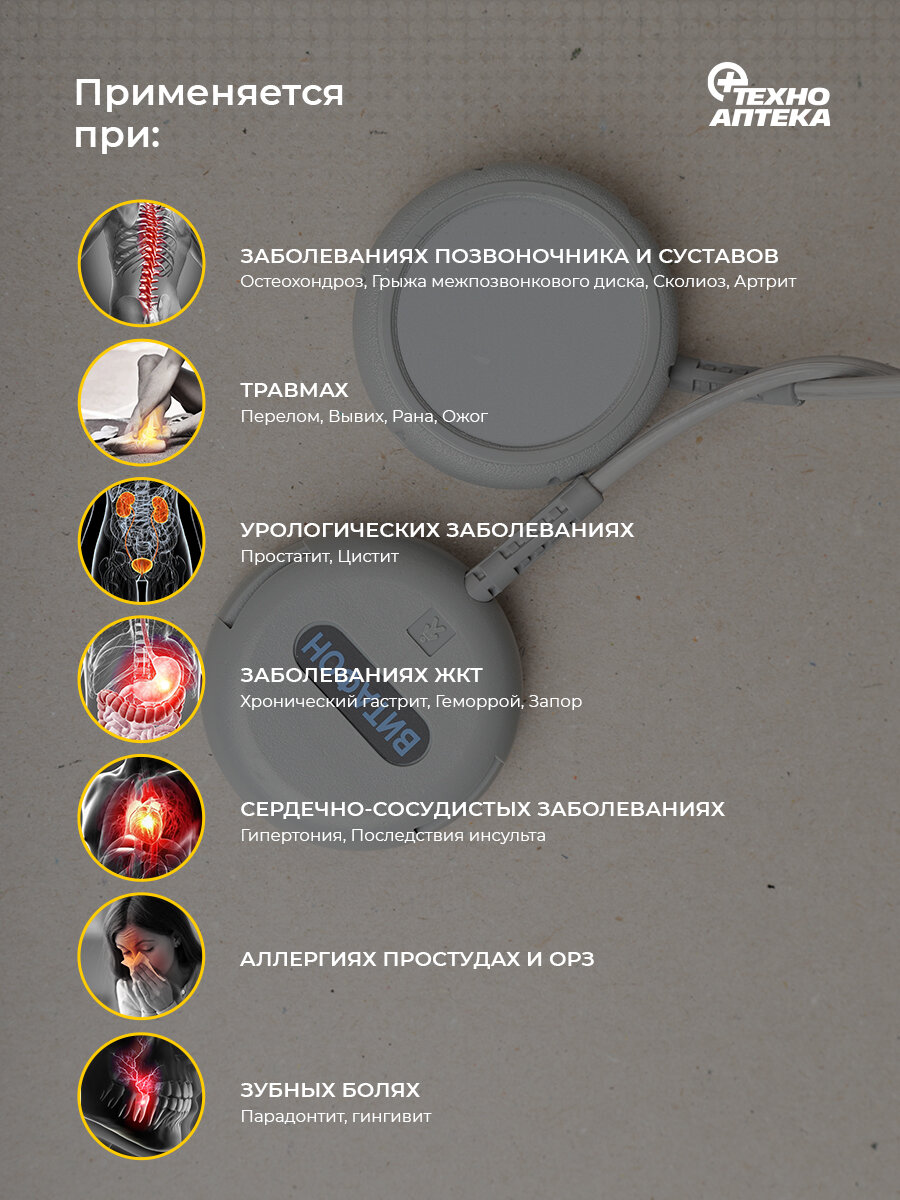 | Отзыв: | Трудно воспринимается пространно написанная инструкция - только на фото разобрались какой стороной круглых мембран прикладывать к больному месту. |