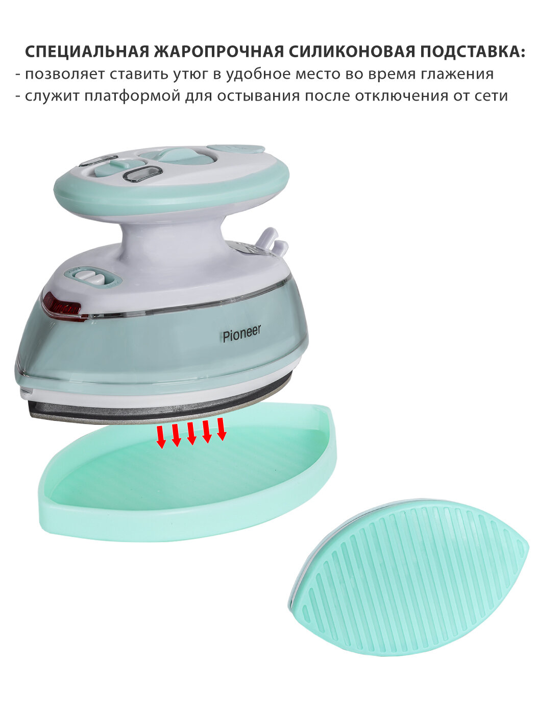 Компактный дорожный утюг SI1003 Pioneer паровой, с антипригарной подошвой и защитной силиконовой подставкой, 408 Вт