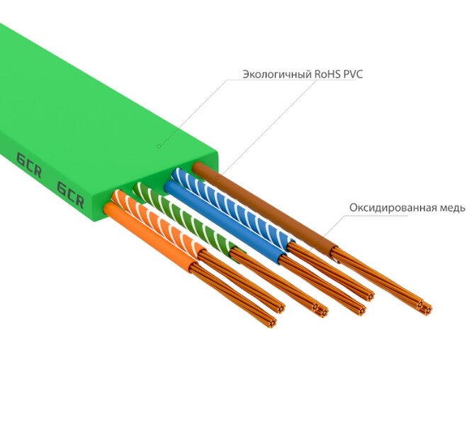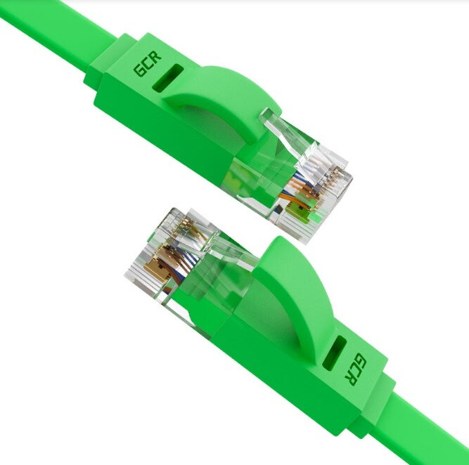 LAN кабель 15м GCR PROF плоский UTP cat.6 10 Гбит/с RJ45 LAN компьютерный кабель для интернета медный контакты 24K GOLD (GCR-LNC62) зеленый