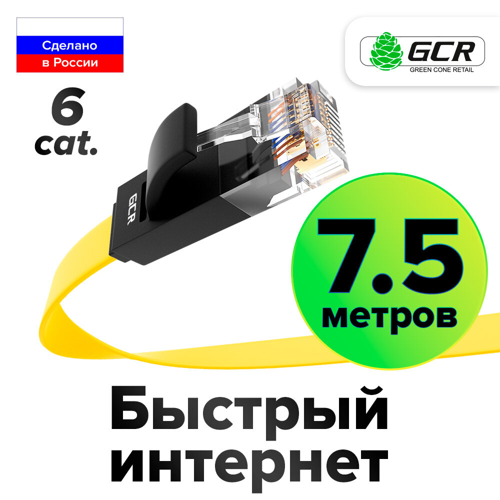 Патч-корд PROF плоский UTP cat.6 10 Гбит/с RJ45 LAN компьютерный кабель для интернета медный контакты 24K GOLD (GCR-LNC62) желтый 7.5м