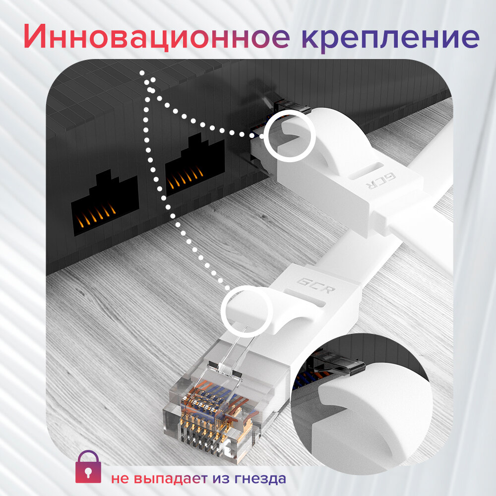 Патч-корд 20м GCR PROF плоский UTP cat.6 10 Гбит/с RJ45 LAN компьютерный кабель для интернета медный контакты 24K GOLD (GCR-LNC62) белый