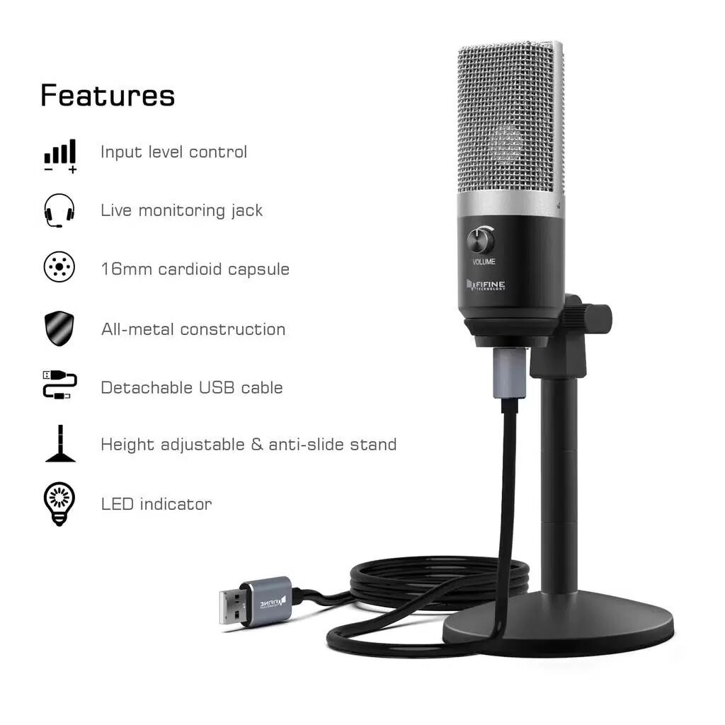 Купить Проводной микрофон Fifine K670, конденсаторный, настольный, USB, серебро
