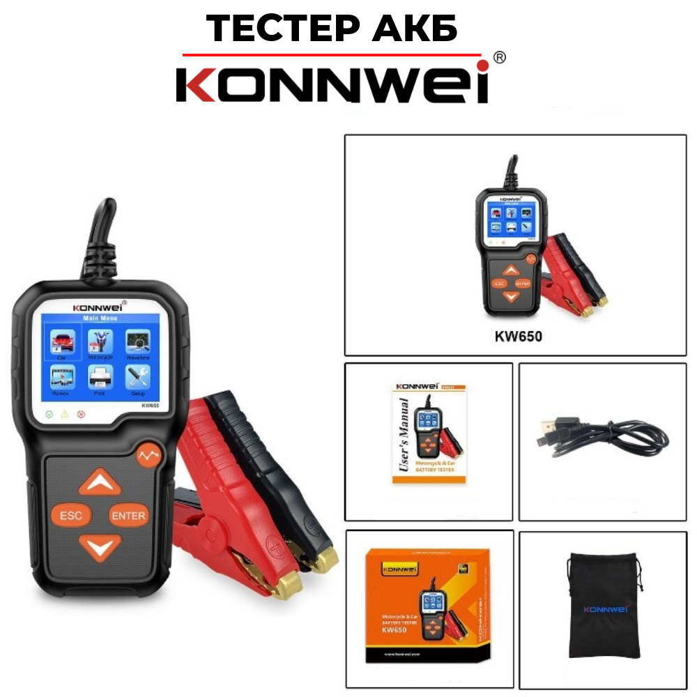 Автомобильный тестер батарей цифровой KONNWEI KW650, с поверкой, Тестер автомобильного аккумулятора, Тестер аккумуляторных батарей KW650