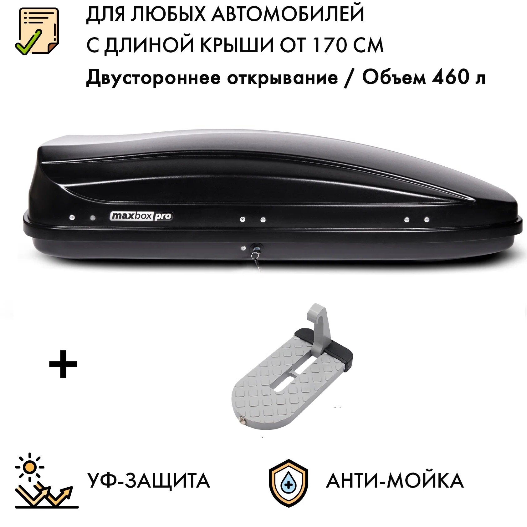 Купить Автобокс MaxBox PRO 460 (средний) черный 175*84*42 см двустороннее открывание (багажный бокс на крышу) + Подножка
