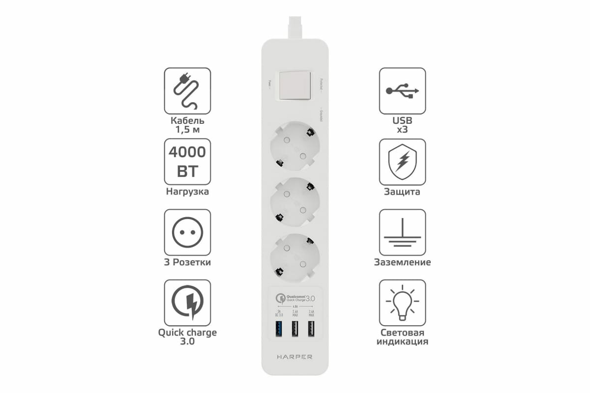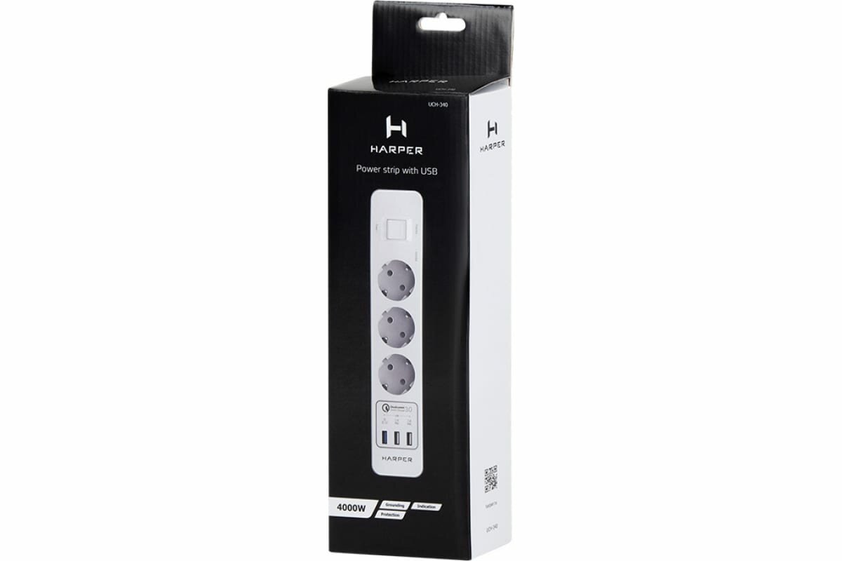 Удлинитель HARPER UCH-340 White QC3.0 Роз.3шт/1.5м/4000W/16A/3xUSB