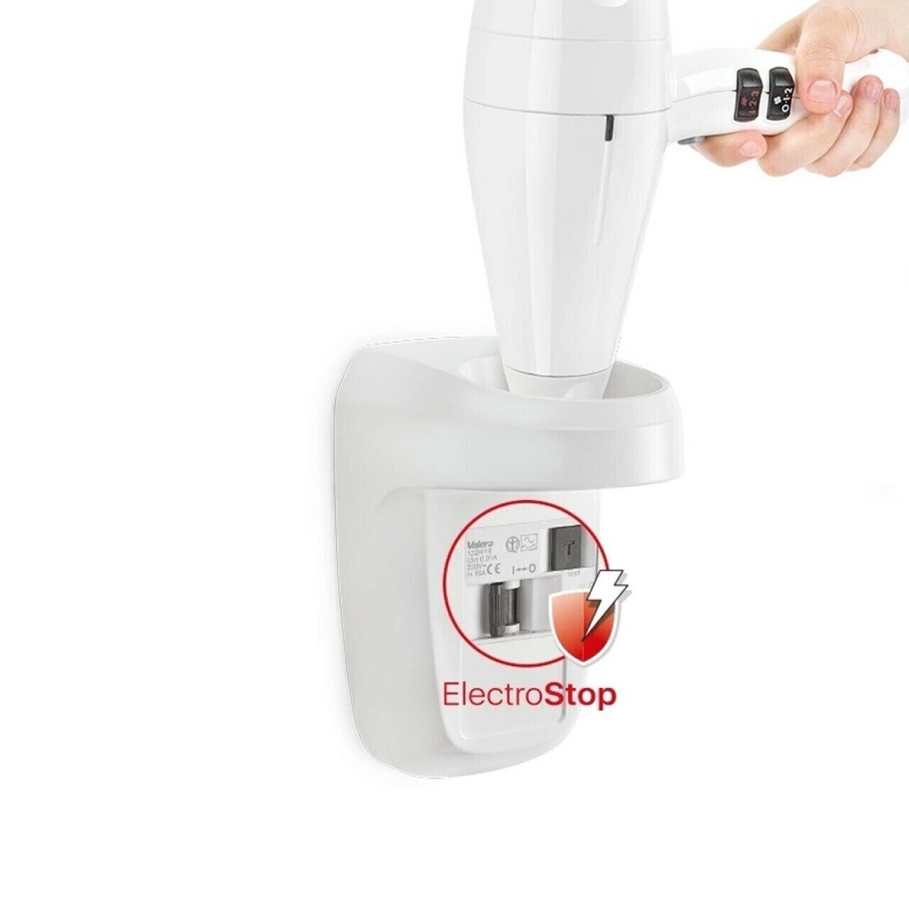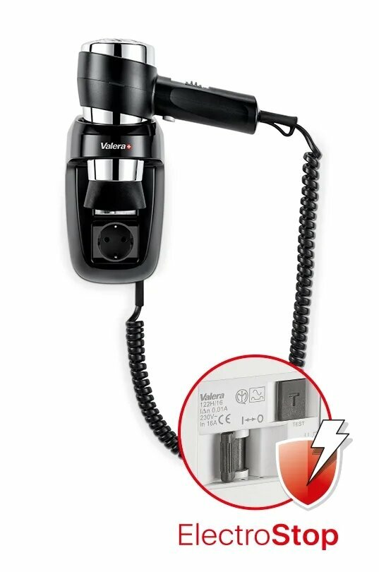 Фен настенный Valera Hospitality Action Protect 1600 Socket (542.06/044.03), мощность 1600 Вт, безопасная кнопка включения/выключения, настенный держатель c устройством защитного отключения, спиральный кабель, розетка 16 А, холодный воздух, концентратор
