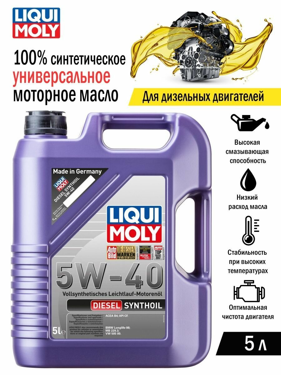 Ниже Вы можете прочитать отзывы на LIQUI MOLY 5W-40 Diesel Synthoil, 5Л (Pao Синт.мотор.масло), ознакомится с подробными характеристиками, посмотреть интересные обзоры и фотографии на LIQUI MOLY 5W-40 Diesel Synthoil, 5Л (Pao Синт.мотор.масло).